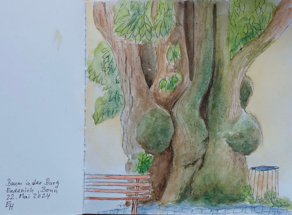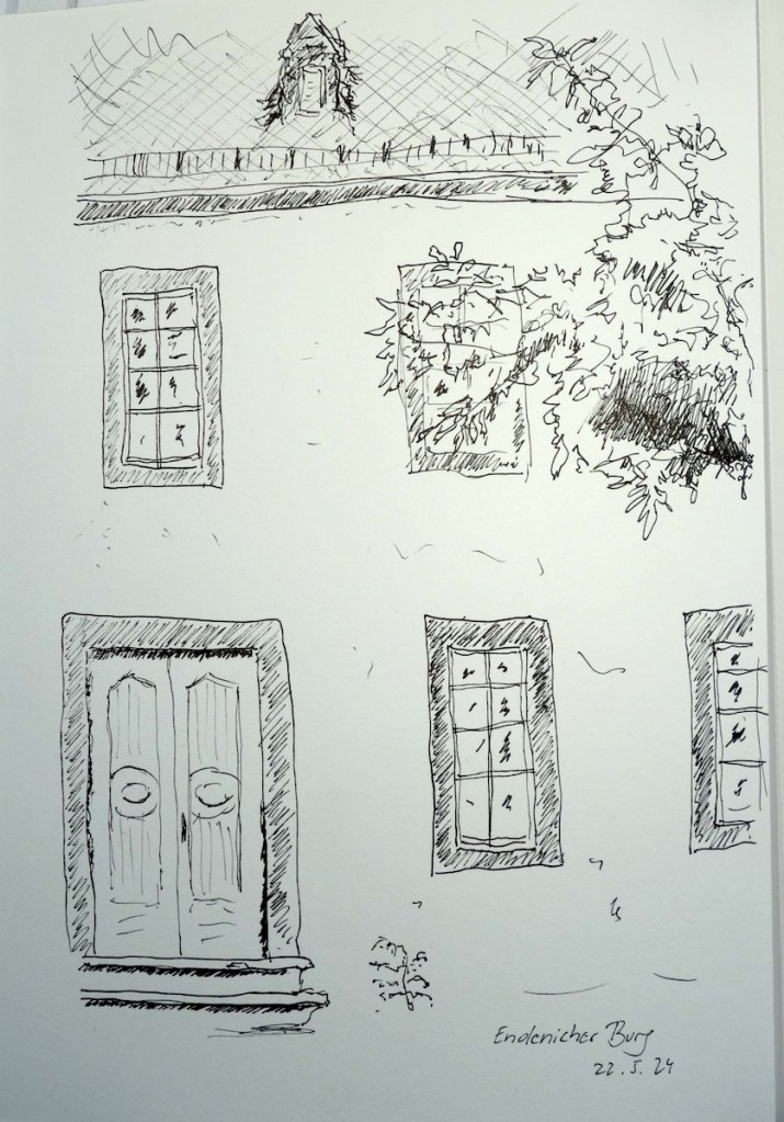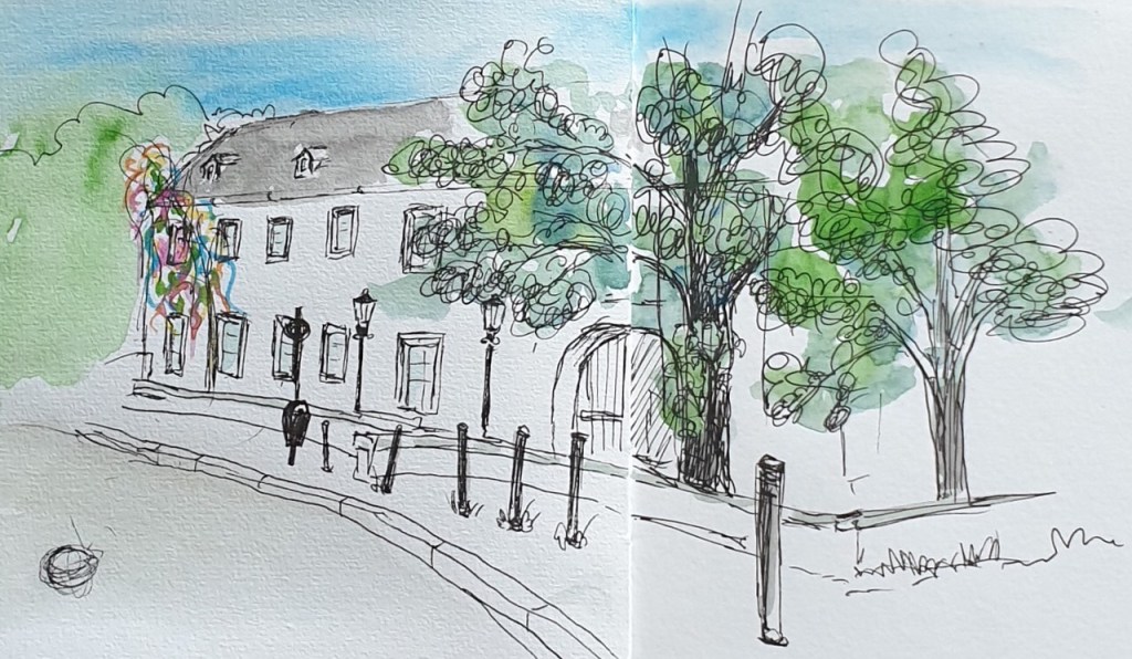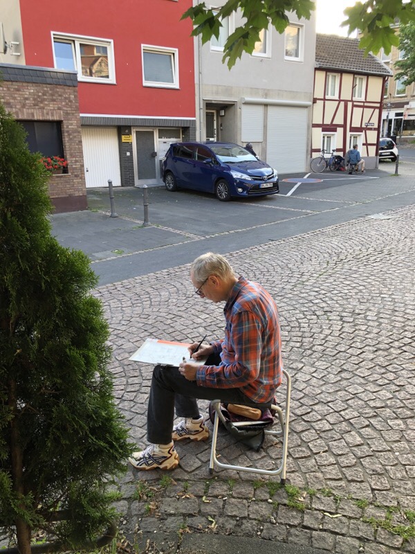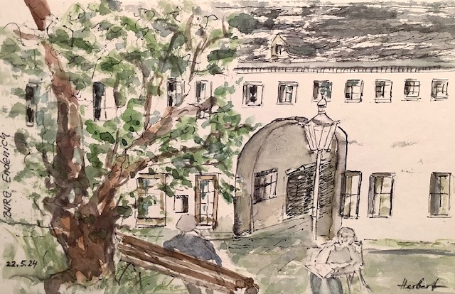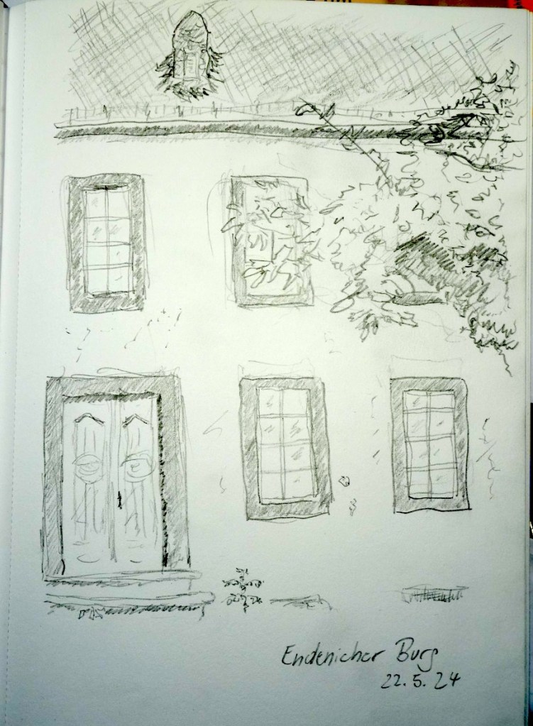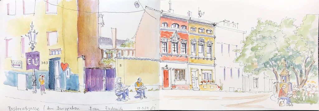 Diesmal, Mittwoch, den 22.05.2024, gehts nach Bonn Endenich ab 18:00 Uhr. An dem Dreieck der Straßen „Am Burggraben“, „Pastoratsgasse“ und „Endenicher Straße“ ist es eigentlich ganz idyllisch im Zentrum des Stadtteils mit kleinen Häuschen und interessanten Blicken. Und es gibt mehrere Einkehrmöglichkeiten mit Außengastronomie. Ein paar Schritte weiter den Burggraben entlang ist die Endenicher Burg, Stadtteilbibliothek, nichts spektakuläres, aber auch hier gibt es viele Zeichenmotive und Unterstellmöglichkeiten bei Regen. Die Vernissage machen wir um 19:45 Uhr am Dreieck vor der Bodega, dem Griechischen Restaurant.