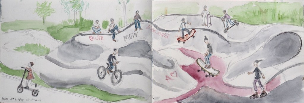 Am kommenden Mittwoch, dem 19.06.2024, treffen wir uns im „Reuterpark“, dem Park am „Haus der Jugend“, Ecke Reuterstraße / Haussdorffstraße ab 18 Uhr – wer kann auch gerne früher. Die Skaterbahn im besonderen, aber auch alle anderen Spielplätze bieten gute Motive, Kinder und Jugendliche voll in Aktion zu zeichnen bzw. es zu probieren. Falls es regnet, was bislang nicht angesagt ist, gibt es wohl Unterstellmöglichkeiten im Haus der Jugend, das bis 19:30 Uhr geöffnet ist. Die Vernissage machen wir um 19:35 Uhr an der Skaterbahn.