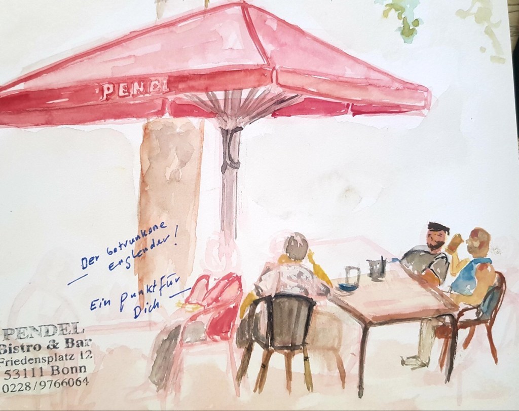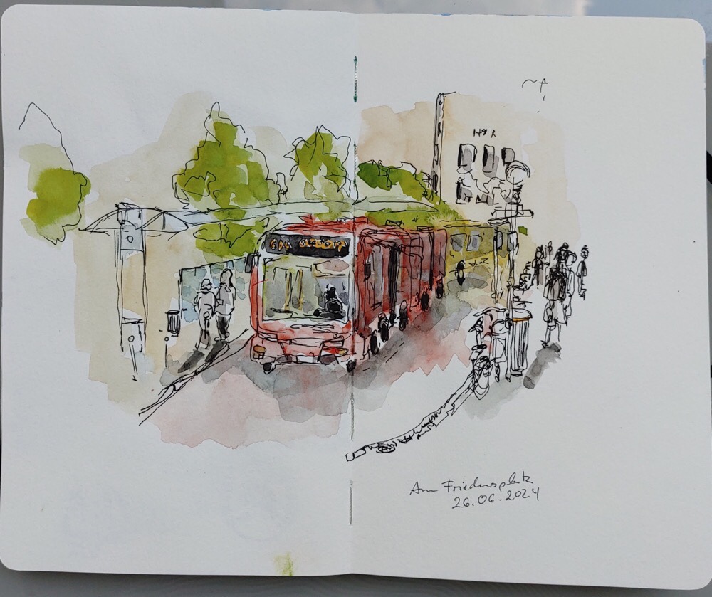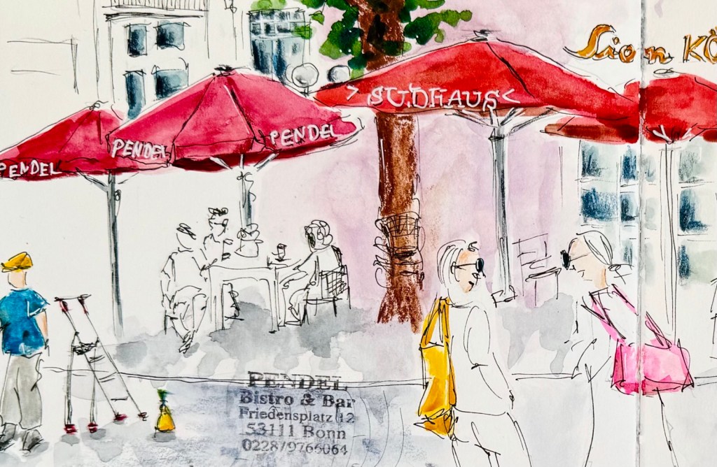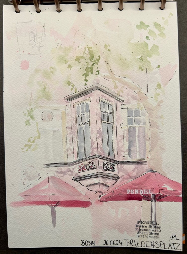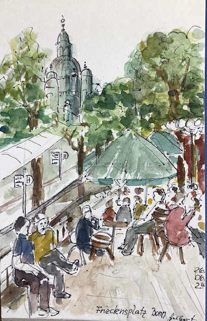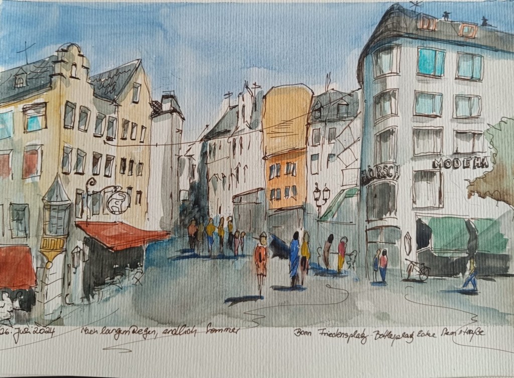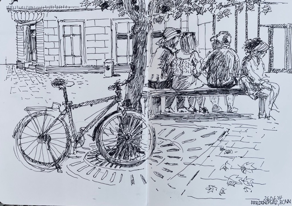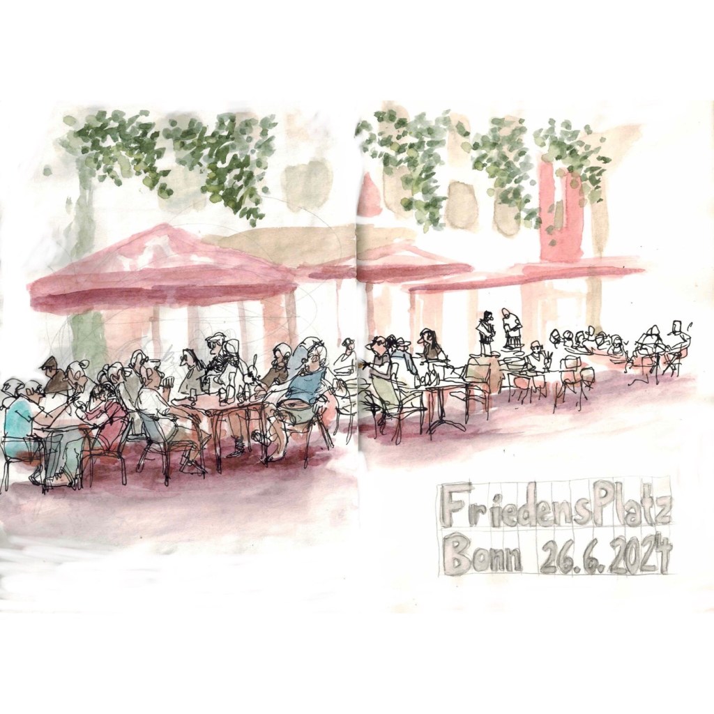 Nächsten Mittwoch, den 26.06.24, treffen wir uns ab 18 Uhr auf dem Friedensplatz Bonn Innenstadt. Dort ist es trubelig und bunt; wir können den Fuballfans beim Public Viewing zuschauen, Busse an- und abfahren sehen, Passanten, Tauben, sonstigen Lebewesen beobachten oder ganz einfach die Umgebung zeichnen. Und dabei den Sommer genießen, der ja nun endlich angekündigt ist.