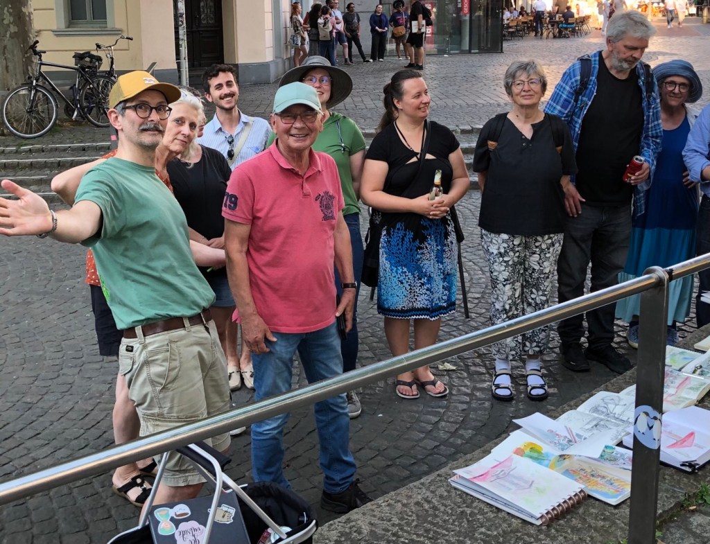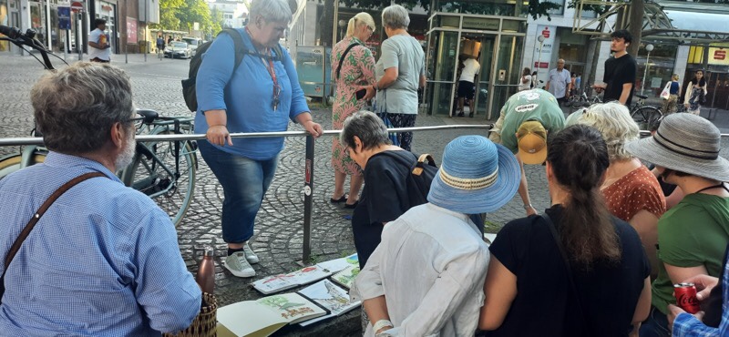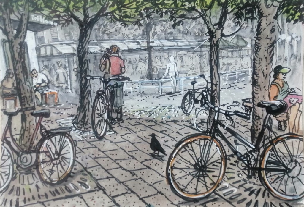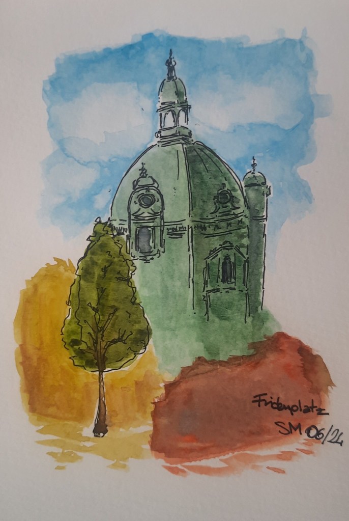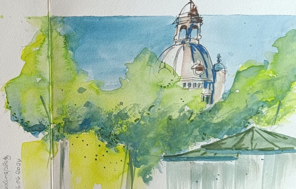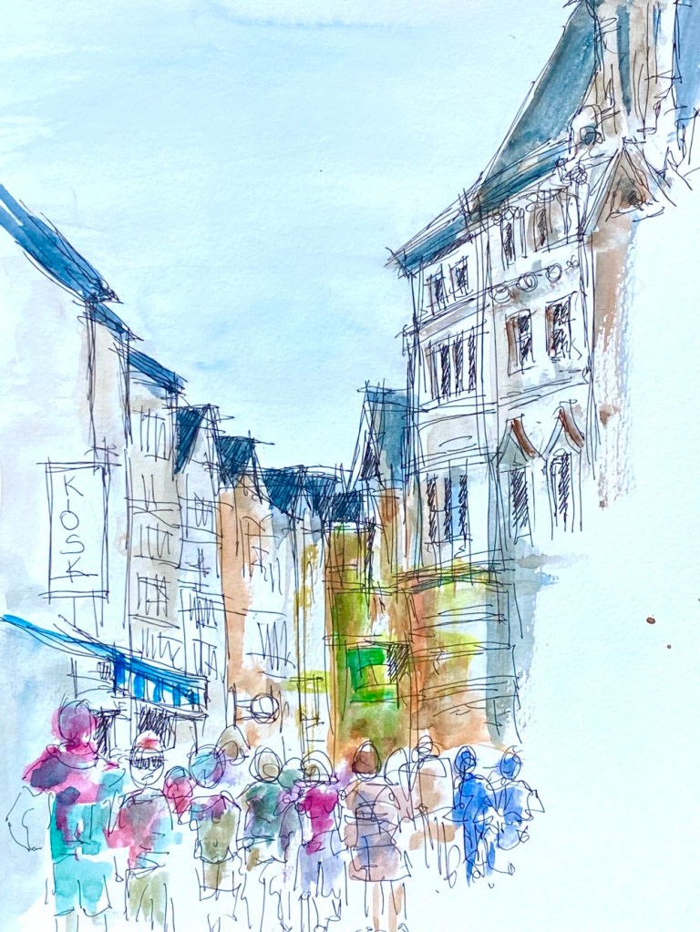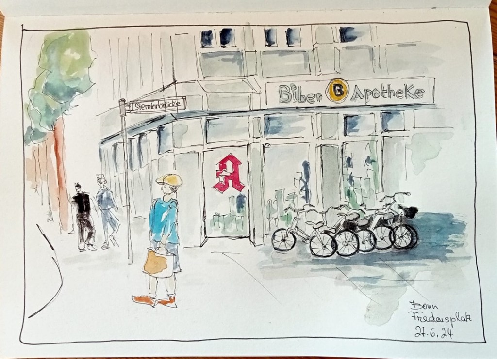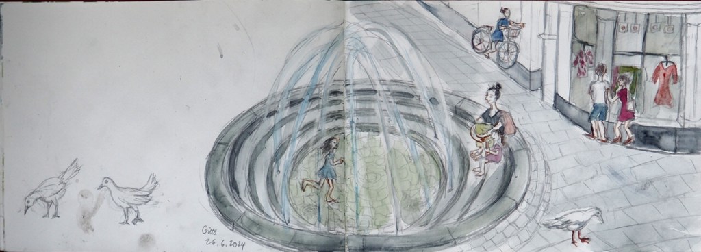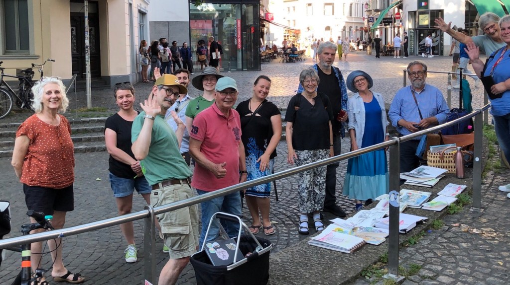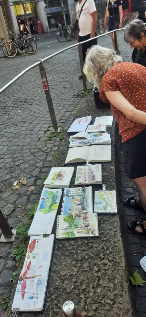 Nächsten Mittwoch, den 26.06.24, treffen wir uns ab 18 Uhr auf dem Friedensplatz Bonn Innenstadt. Dort ist es trubelig und bunt; wir können den Fuballfans beim Public Viewing zuschauen, Busse an- und abfahren sehen, Passanten, Tauben, sonstigen Lebewesen beobachten oder ganz einfach die Umgebung zeichnen. Und dabei den Sommer genießen, der ja nun endlich angekündigt ist.