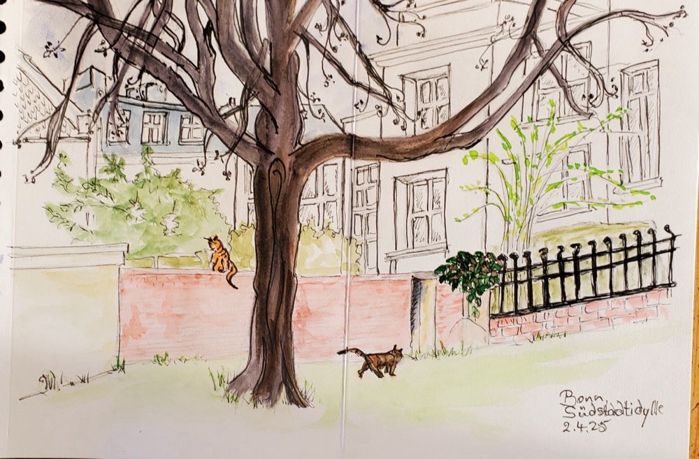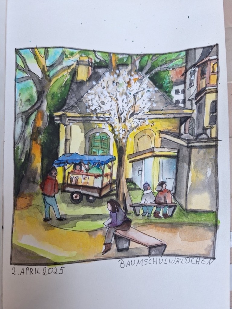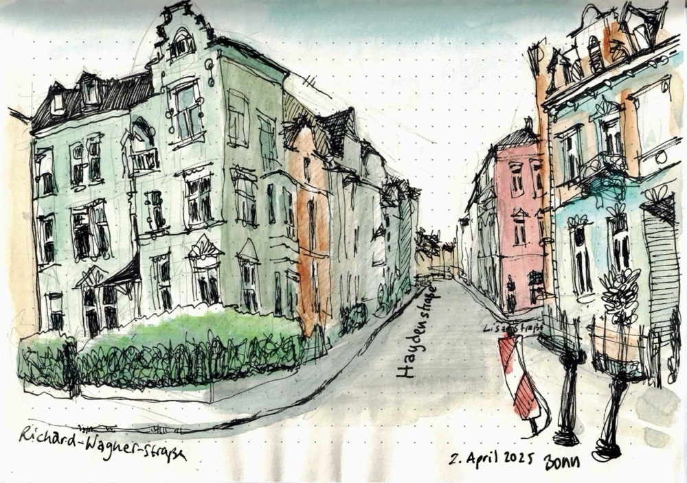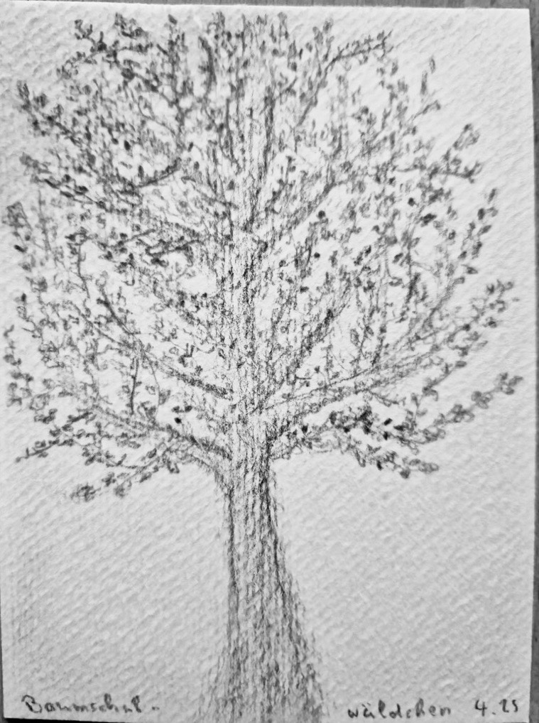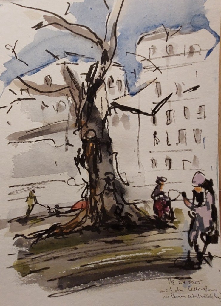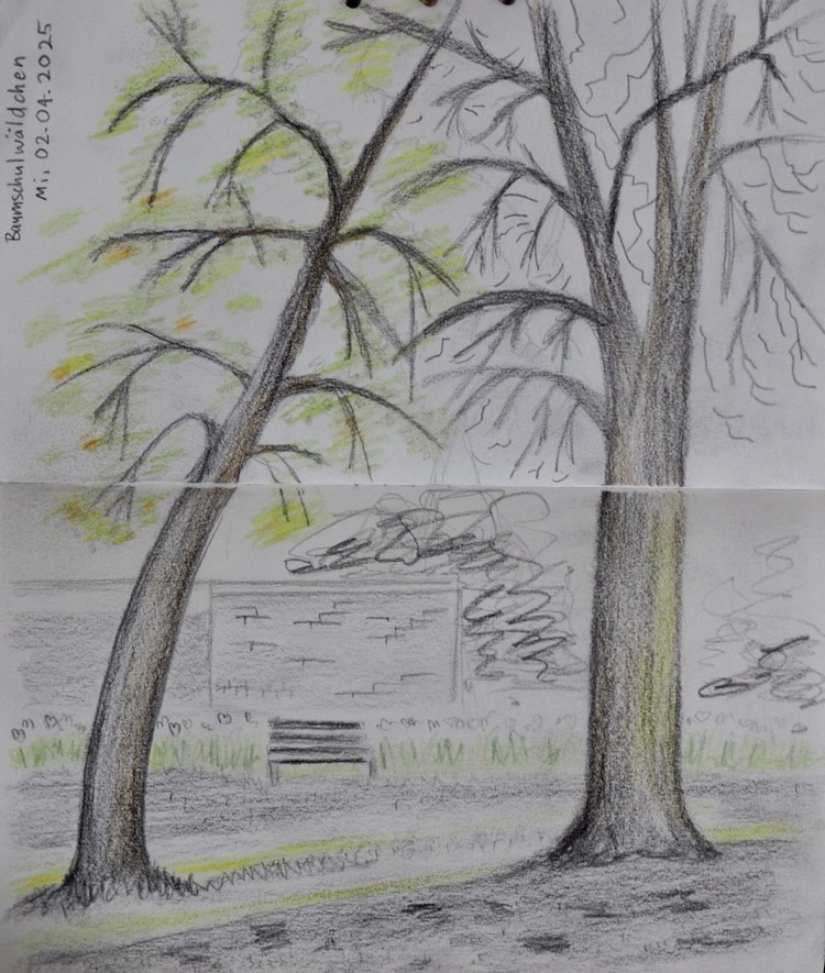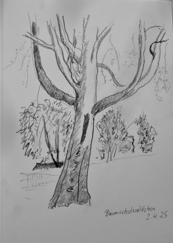 Am Mittwoch, dem 02.04.2025, zeichnen wir ab 18 Uhr (es wird jetzt wieder nachmittags länger hell sein) gemeinsam im Musikerviertel und/oder im Baumschulwäldchen. (Angekündigt sind Temperaturen um etwa 15 Grad am Nachmittag.)