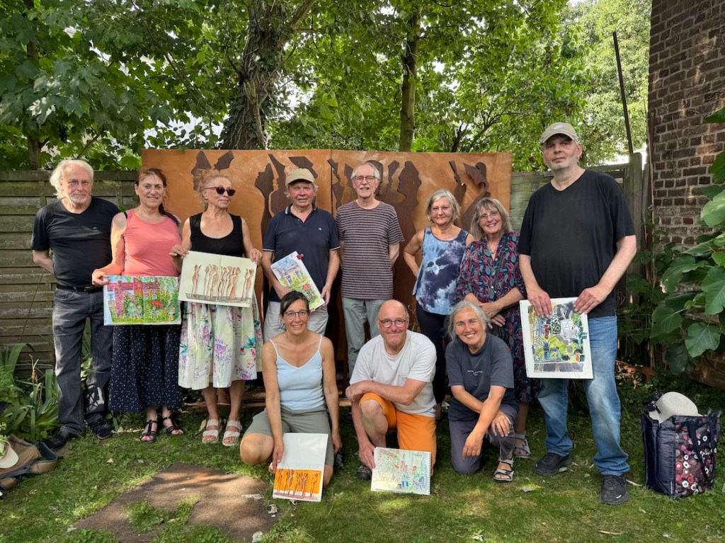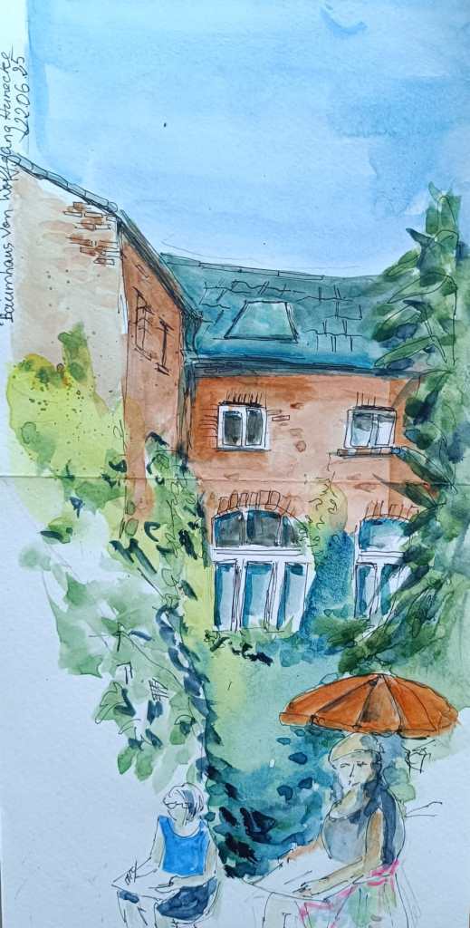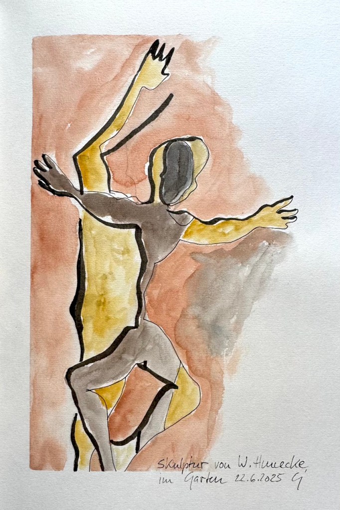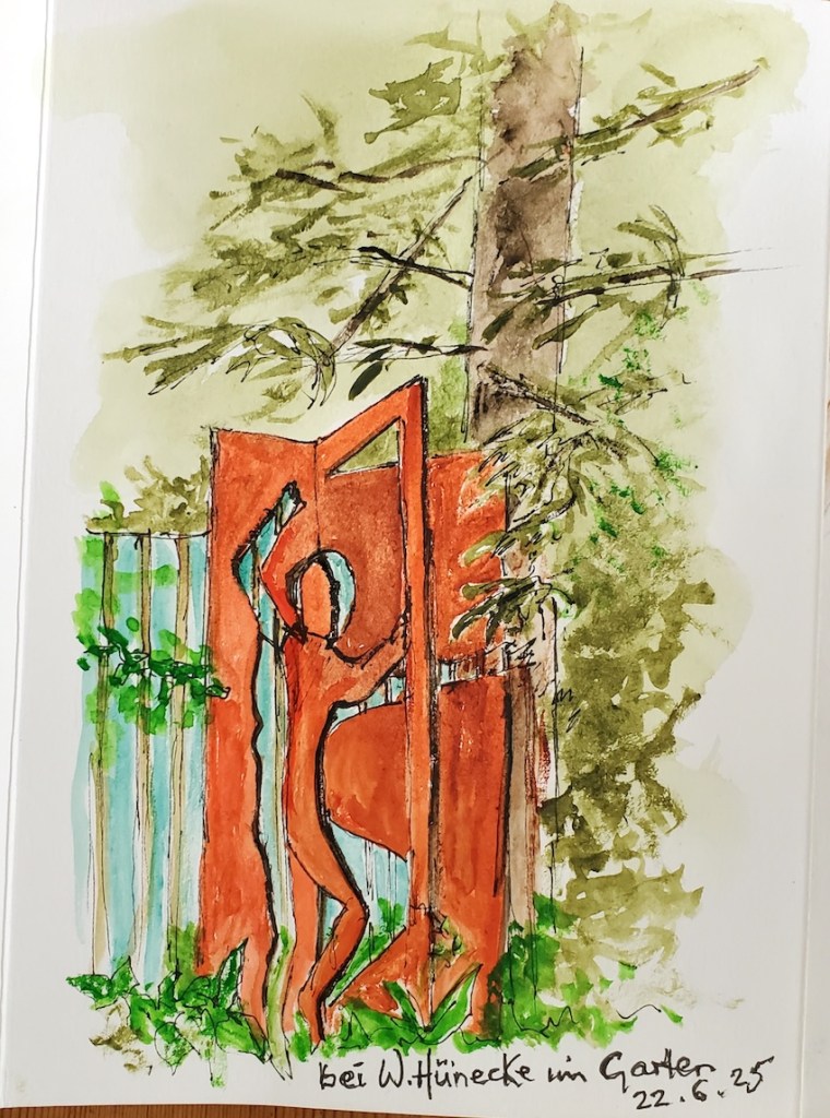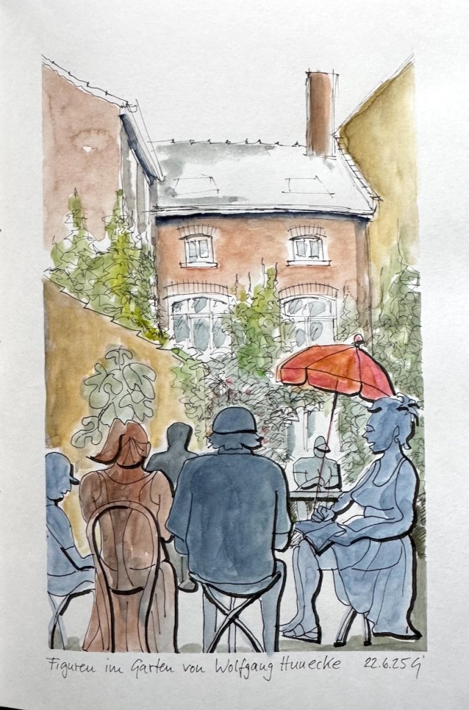 Der Künstler, der die Skulptur „Passanten“ geschaffen hat, die wir vor Kurzem auf dem Konrad Adenauer Platz gesehen und gezeichnet haben, hat sein „Baumhaus Atelier“ in Beuel und lädt uns ein, bei ihm im Garten zu zeichnen. Das wollen wir natürlich gerne wahrnehmen und treffen uns dort am Sonntag, dem 22.06.2025, um 15:00 Uhr vor dem „Baumhaus Atelier“ in der Kreuzstraße 47 in 53225 Bonn Beuel. Bitte wartet dort bis wir alle beisammen sind – wir wollen Wolfgang nicht damit belästigen, dass er jedem die Tür einzeln aufmachen muss.