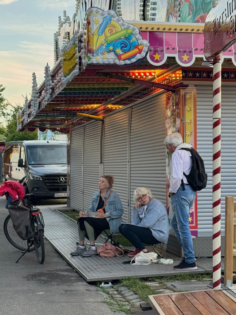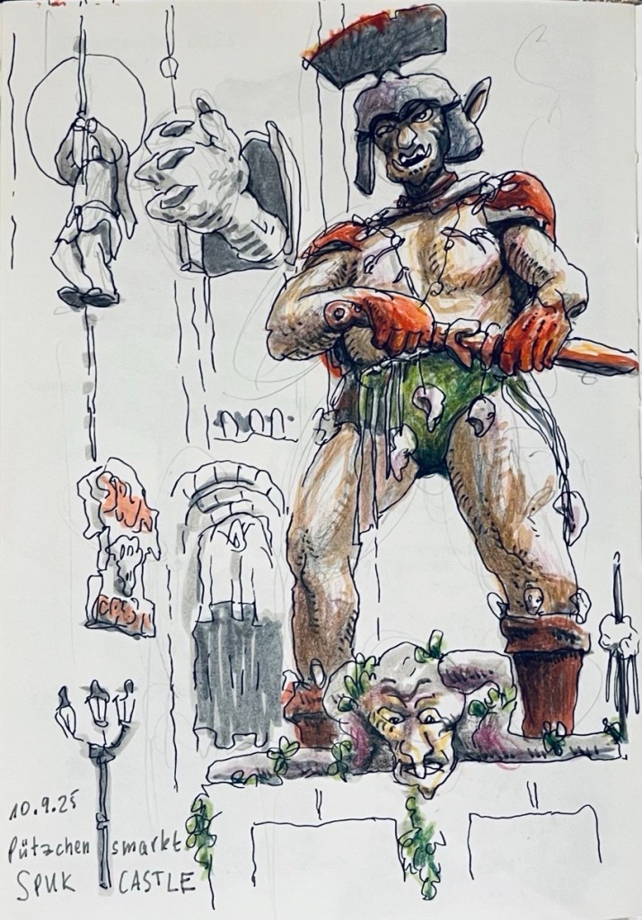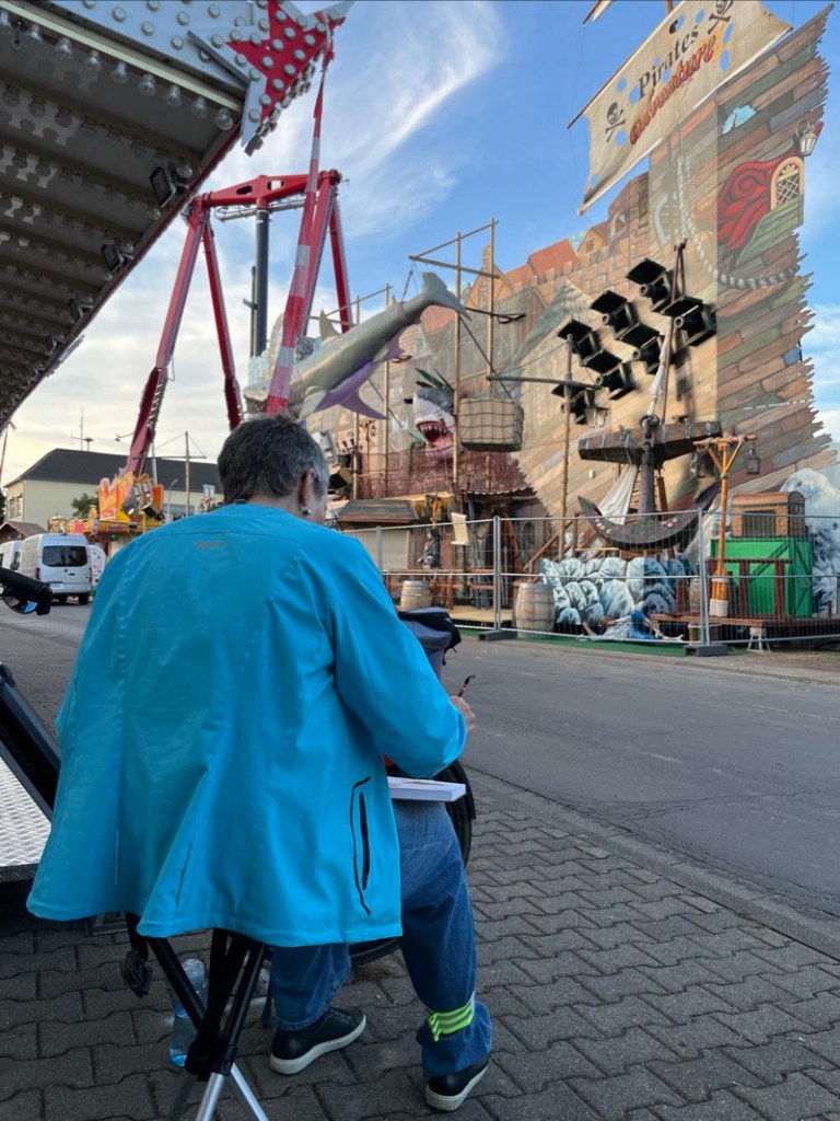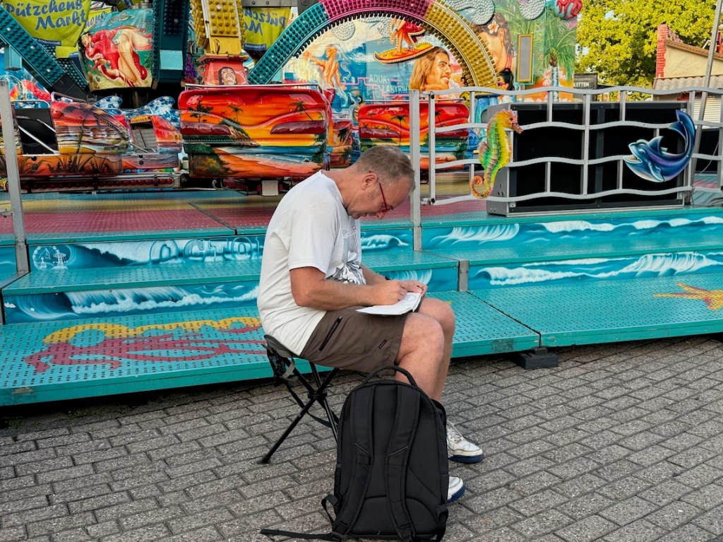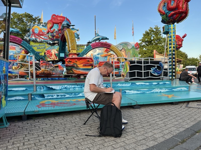 Wir treffen uns am 10.09.2025 ab 18 Uhr oder früher an der Marktschule in Pützchen Bechlinghofen. Adresse: Marktstraße Ecke Friedensstraße. Von hier aus ist ein guter Zugang zu Pützchens Markt, der noch im Aufbau ist und erst am Freitag beginnt. Insofern können wir hier noch zeichnen, Budenaufbau, Maschinen, Gedöns und was es sonst noch gibt. Ein Höckerchen mitbringen ist hilfreich.