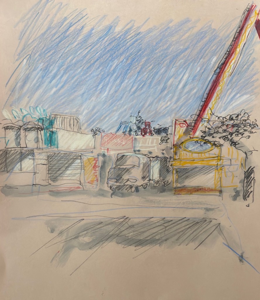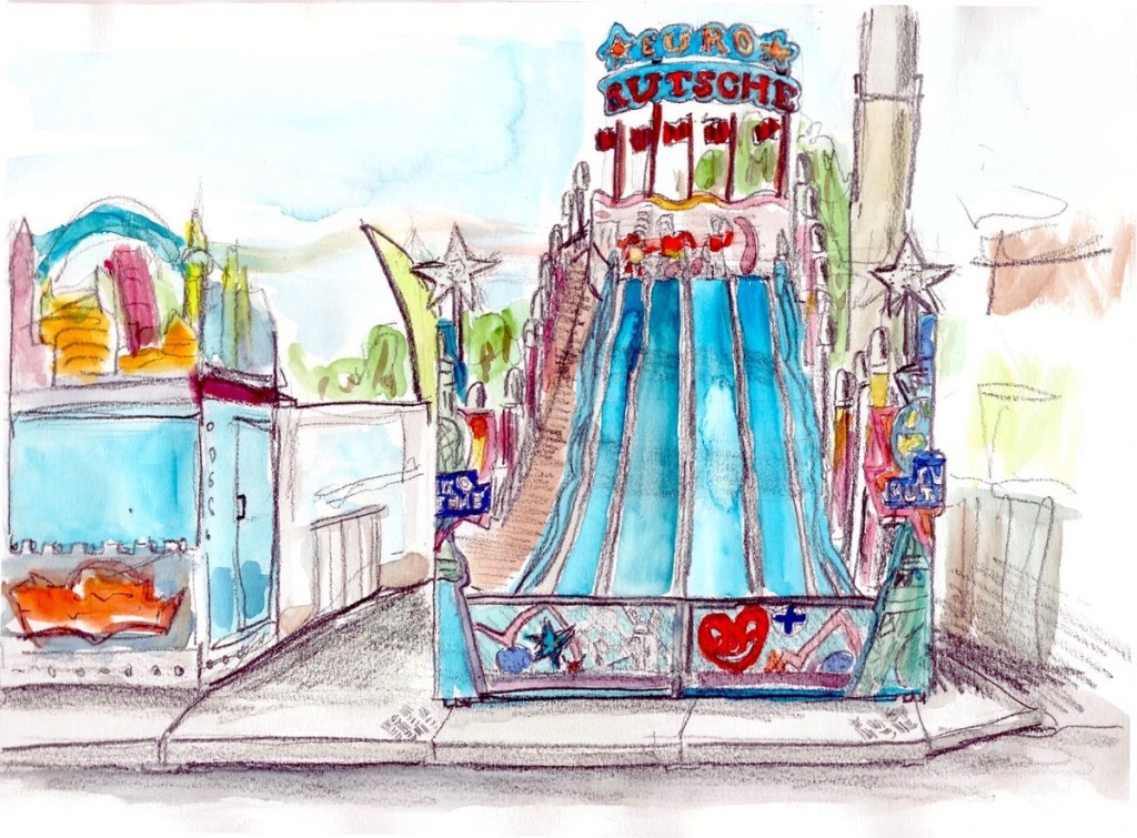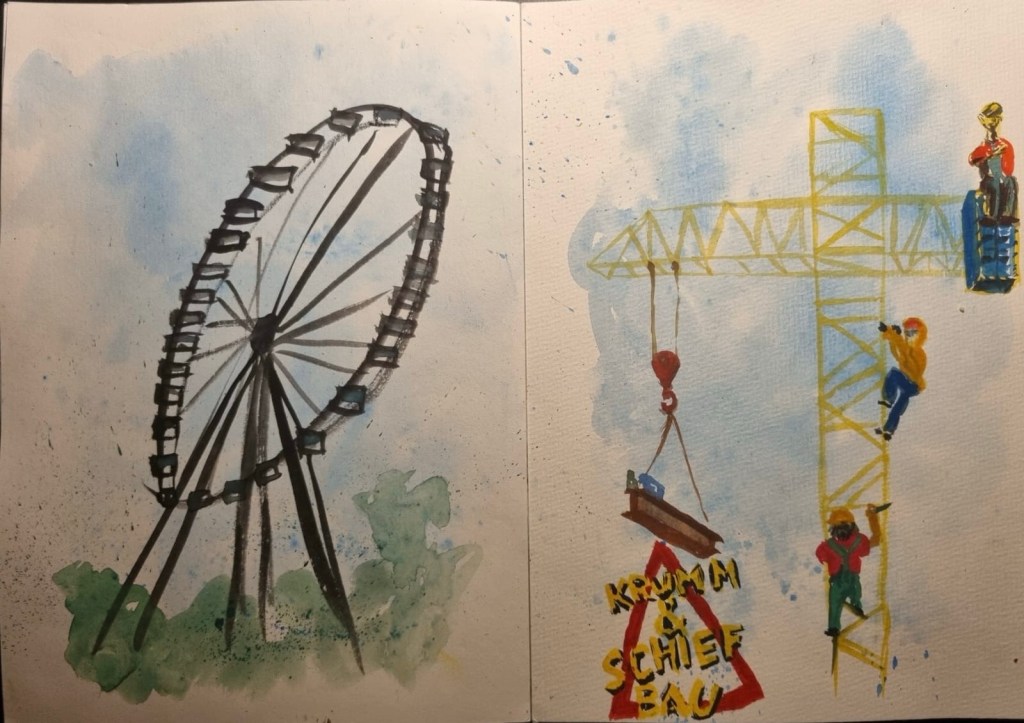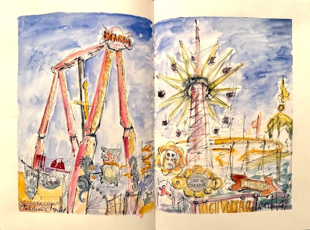 Wir treffen uns am 10.09.2025 ab 18 Uhr oder früher an der Marktschule in Pützchen Bechlinghofen. Adresse: Marktstraße Ecke Friedensstraße. Von hier aus ist ein guter Zugang zu Pützchens Markt, der noch im Aufbau ist und erst am Freitag beginnt. Insofern können wir hier noch zeichnen, Budenaufbau, Maschinen, Gedöns und was es sonst noch gibt. Ein Höckerchen mitbringen ist hilfreich.