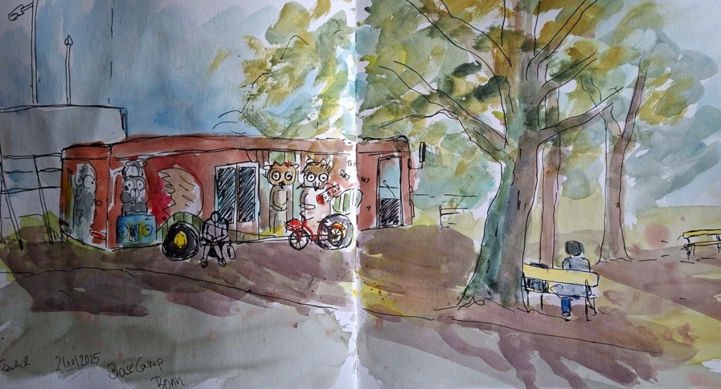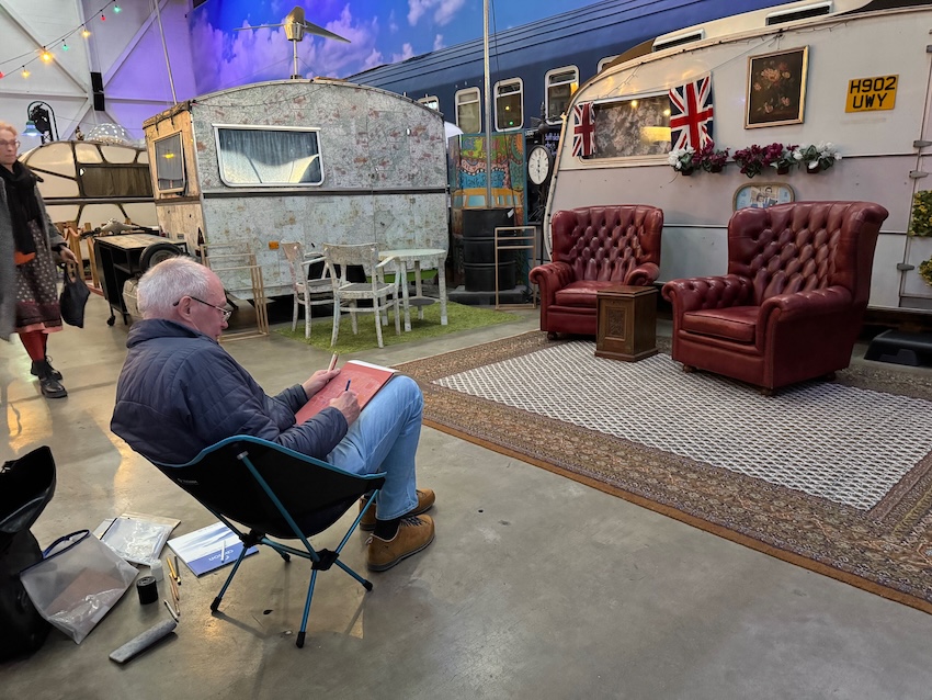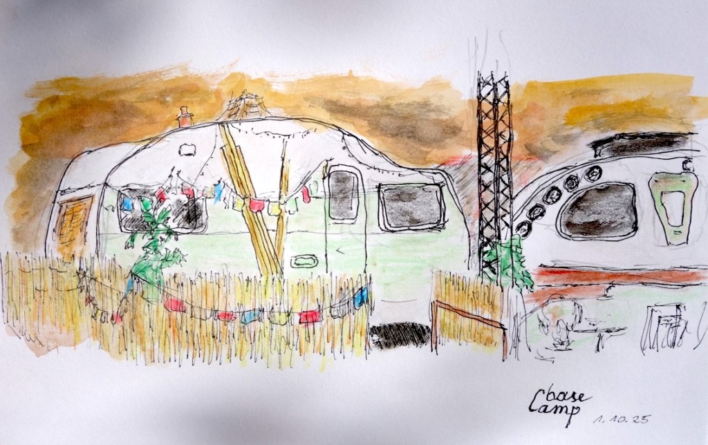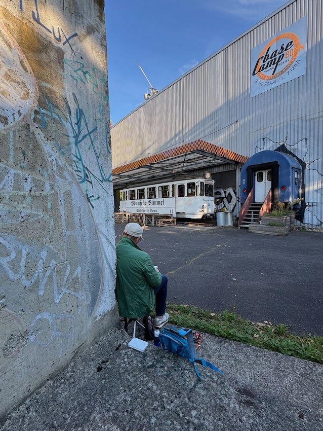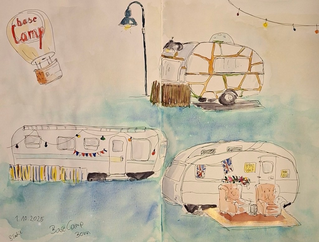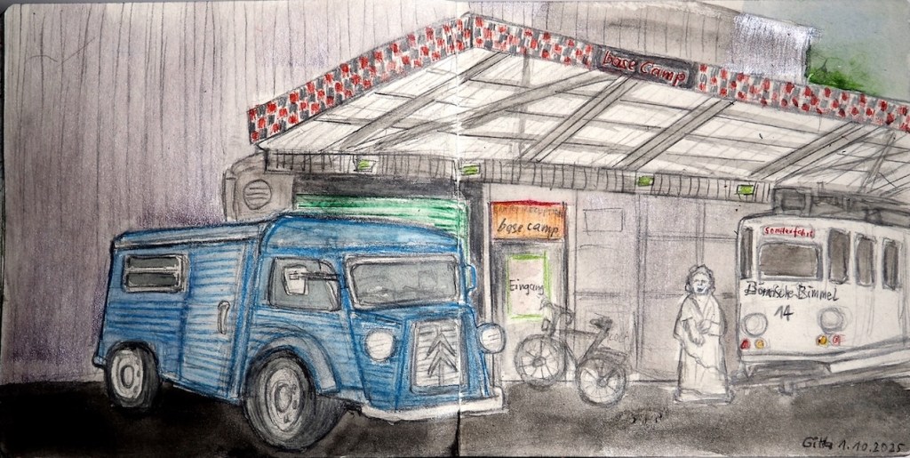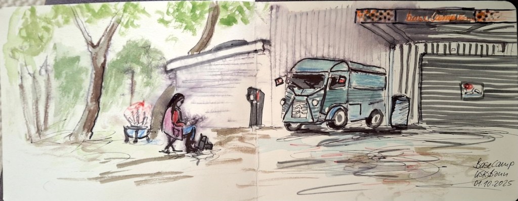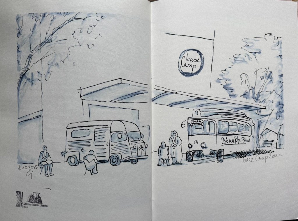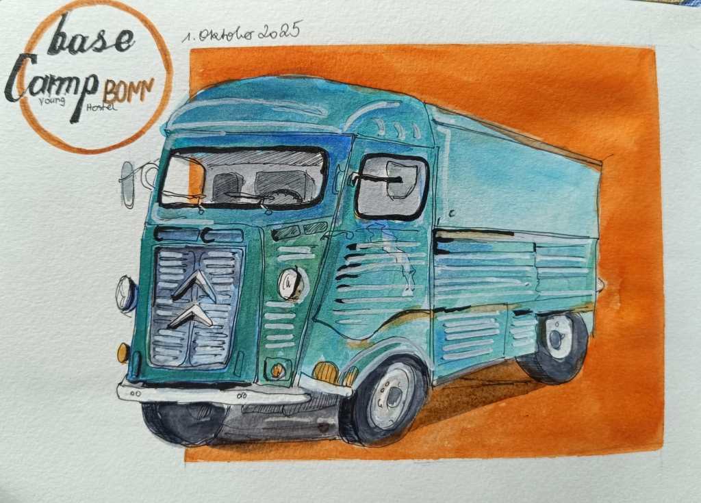 Das Basecamp Hostel bezeichnet sich als „der erste und einzige Indoor-Vintage-Campingplatz der Galaxie“. Sage einfach drinnen bescheid, dass Du bei den „Urban Sketchers Bonn“ bist und frag, wo Du überall hinkannst. Denk daran, dass einige der Wohnmobile vermietet sein könnten 🙂 (Wetter: Die Temperaturen sollen ganz gut werden, Regnen soll es auch nicht, und draußen gibt’s im Notfall auch genug zu zeichnen.)