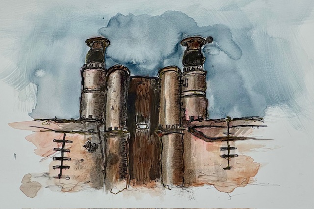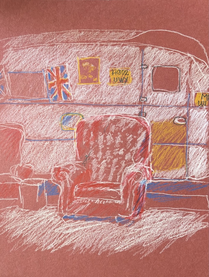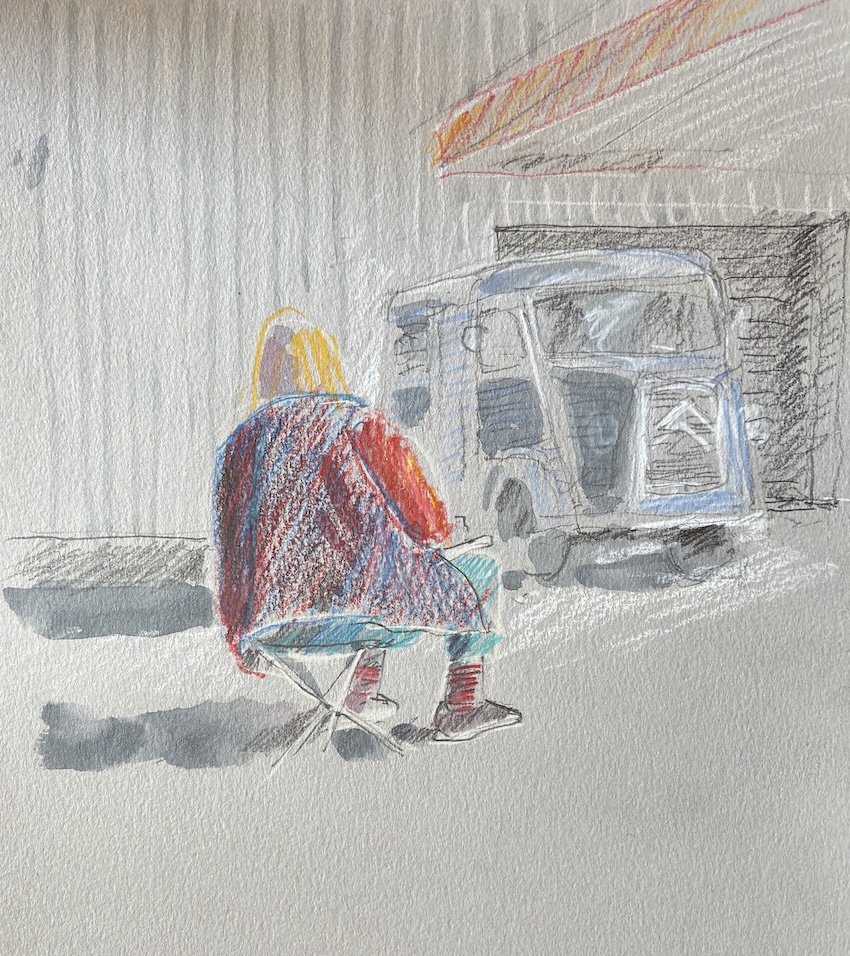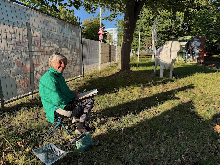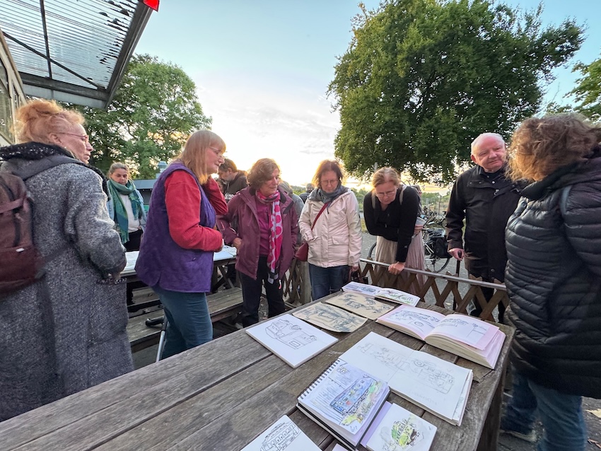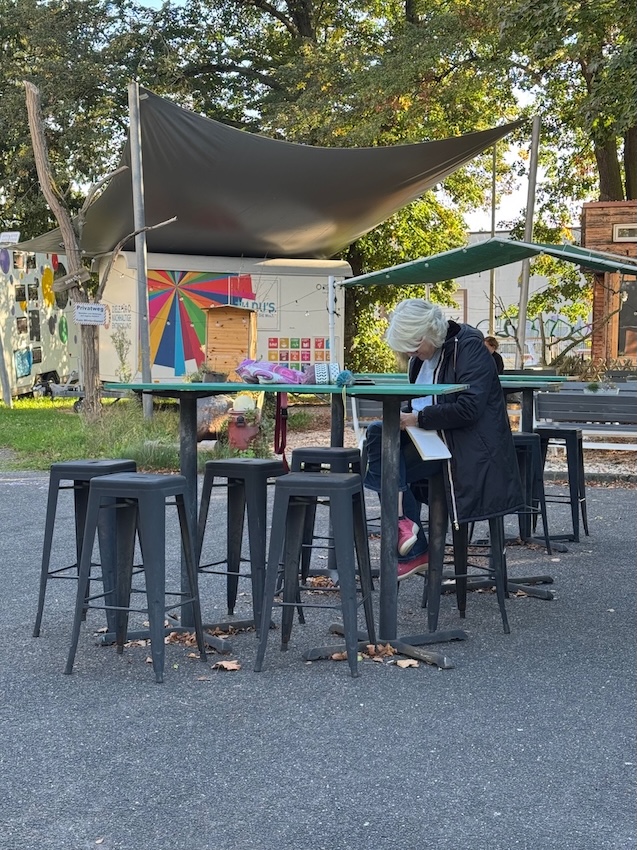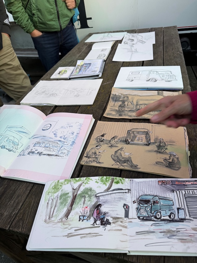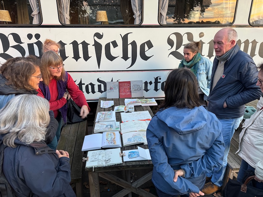 Schau Dich um und finde interessante Motive für Deine Skizzen! Frag, ob Du drinnen sitzen kannst, um die Wohnmobile zu zeichnen. Die Vernissage machen wir um 19:00 Uhr, wo wissen wir noch nicht, vielleicht drinnen auf der Empore, vielleicht draußen, in der Nähe des Bonner Bimmels, aber keine Sorge, wir finden Dich schon.