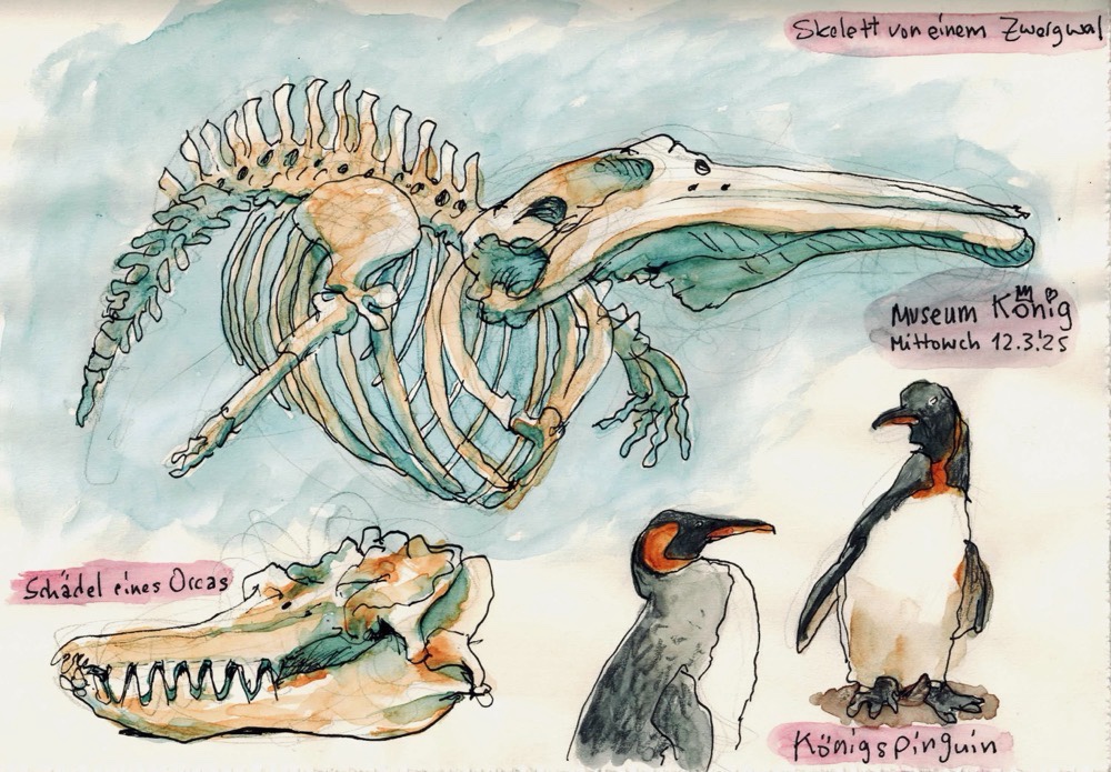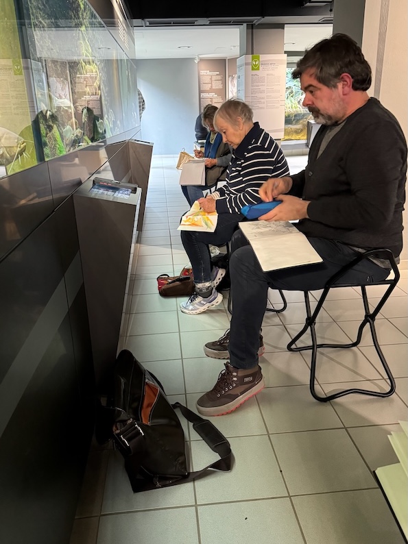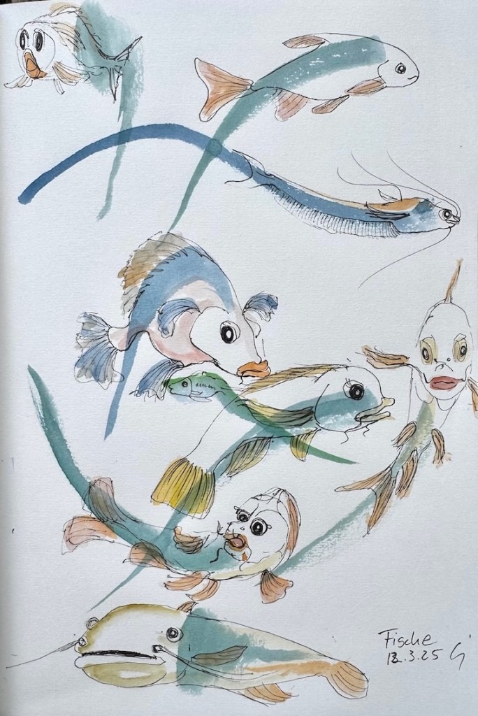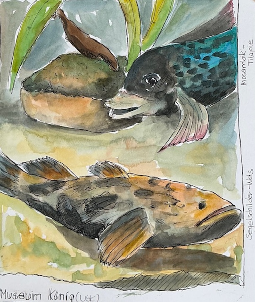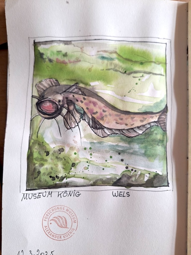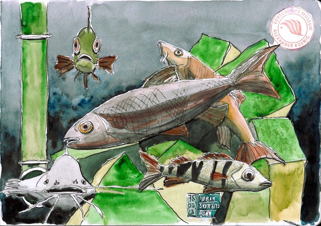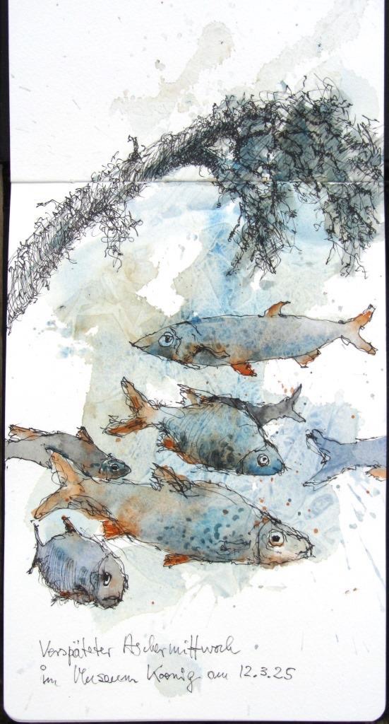 Normalerweise machen wir diese „Fischsession“ zu Aschermittwoch – da wir aber letzten Mittwoch die Möglichkeit hatten im Hotel Vienna House Easy zu zeichnen, haben wir es verschoben. Es wird spannend: die Fische und Amphibien sind NICHT ausgestopft sondern putzmunter. Entsprechend herausfordernd ist es, sie in ihrem Charakter einzufangen und aufs Papier zu bannen. Die Vernissage findet statt um 19:30 Uhr in der Eingangshalle des Museums.