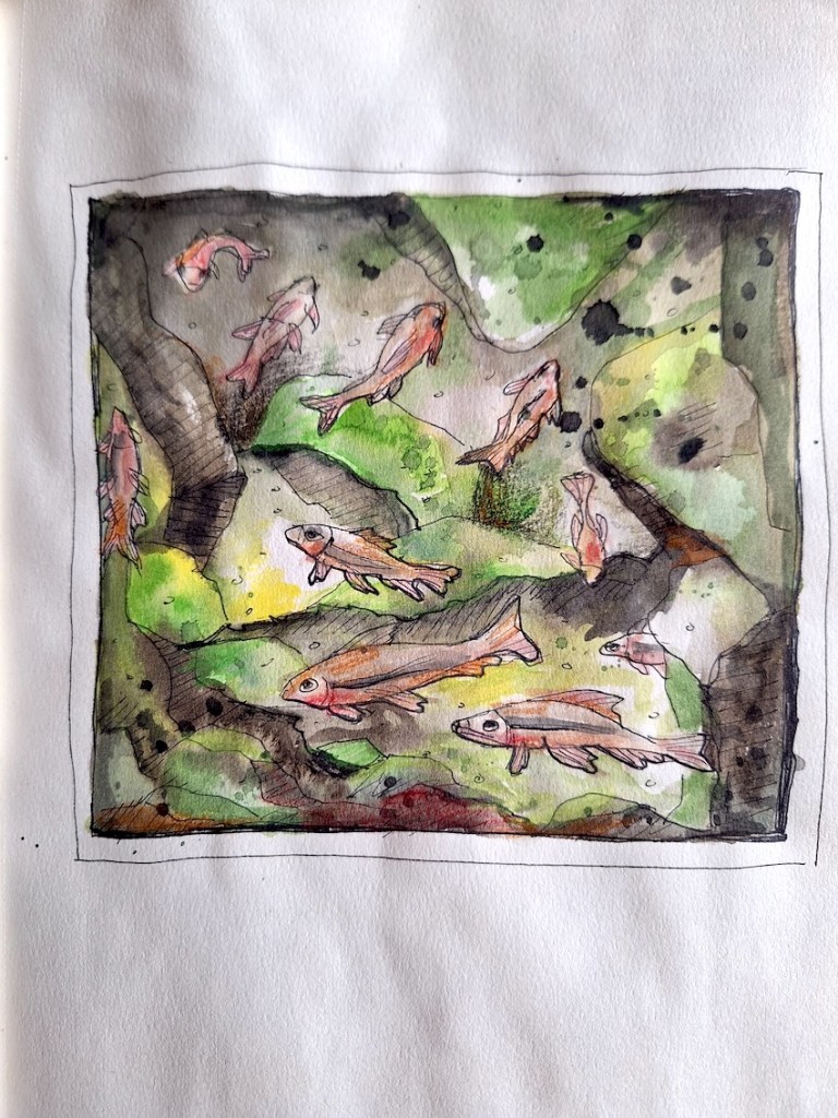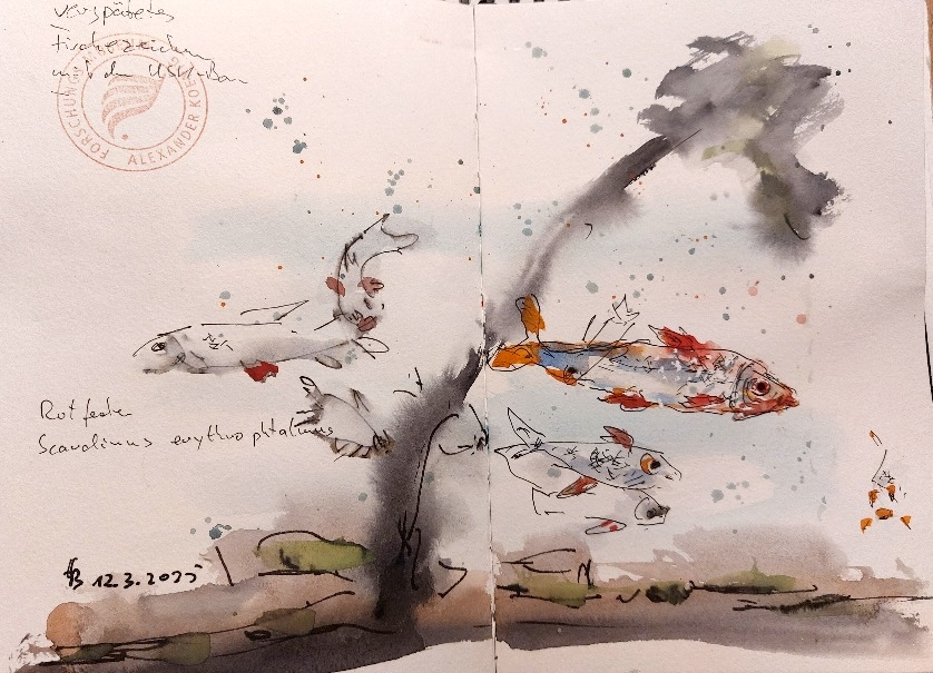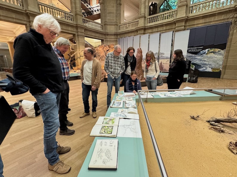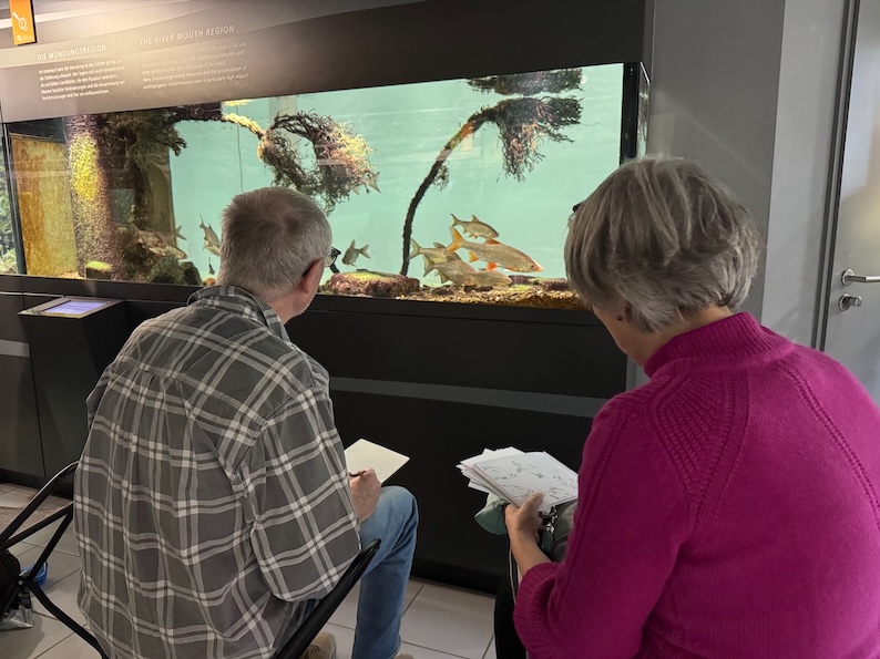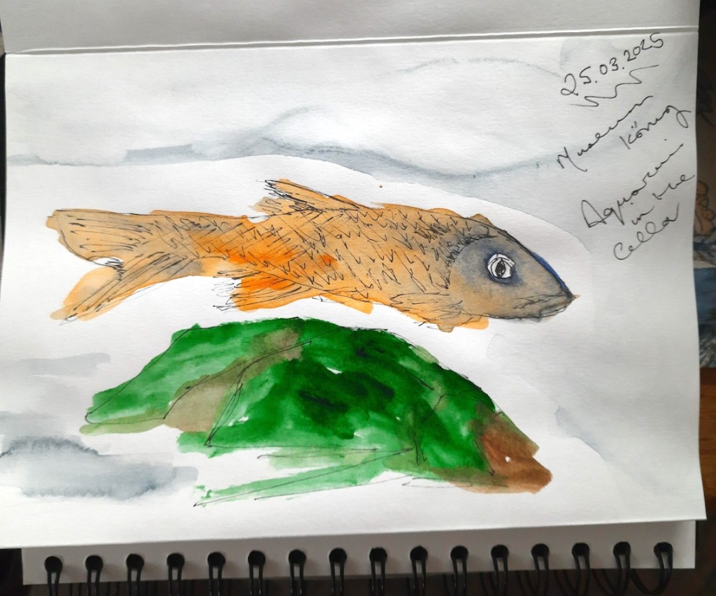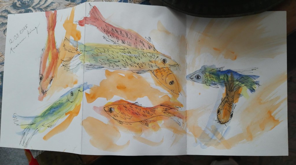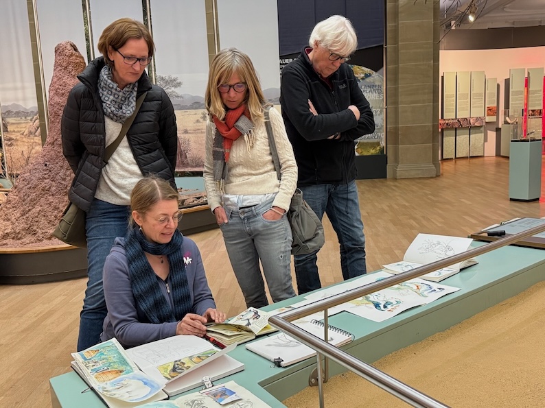 Normalerweise machen wir diese „Fischsession“ zu Aschermittwoch – da wir aber letzten Mittwoch die Möglichkeit hatten im Hotel Vienna House Easy zu zeichnen, haben wir es verschoben. Es wird spannend: die Fische und Amphibien sind NICHT ausgestopft sondern putzmunter. Entsprechend herausfordernd ist es, sie in ihrem Charakter einzufangen und aufs Papier zu bannen. Die Vernissage findet statt um 19:30 Uhr in der Eingangshalle des Museums.