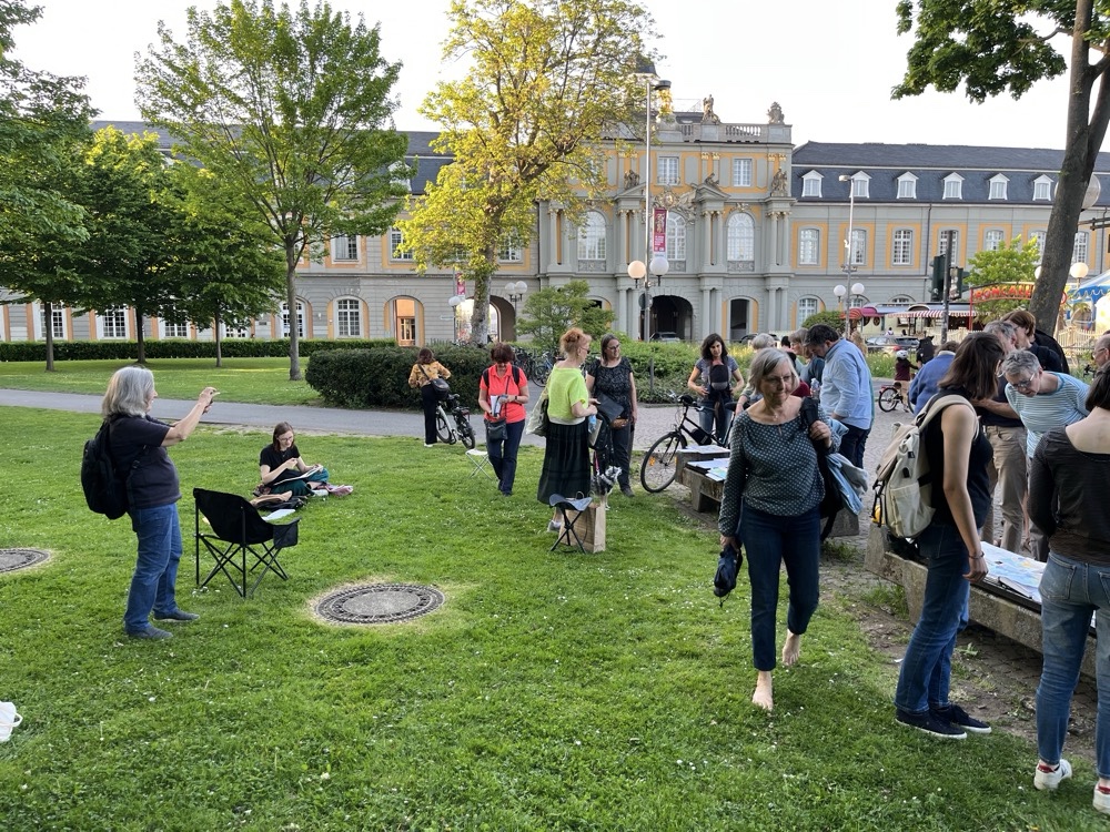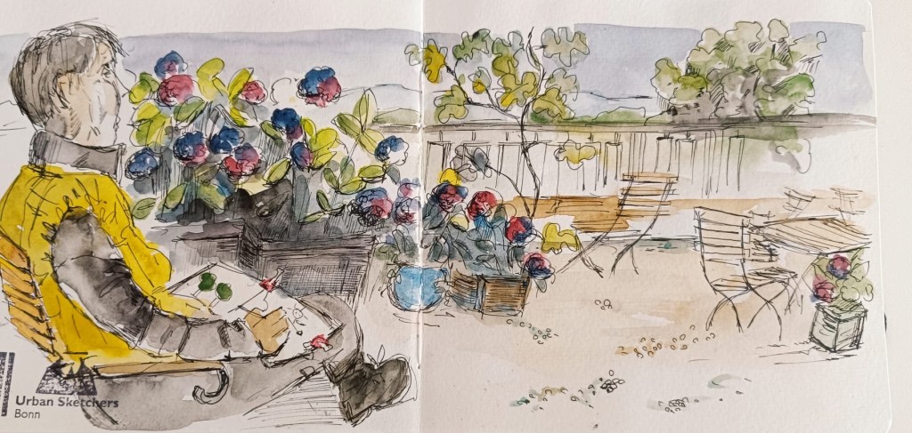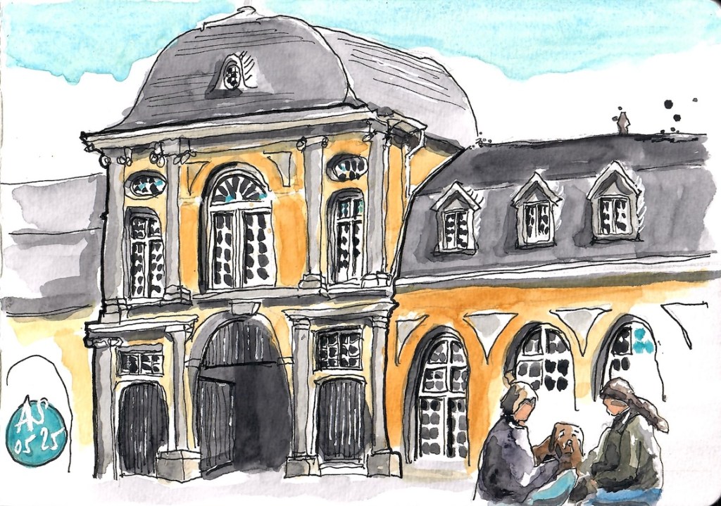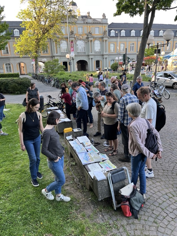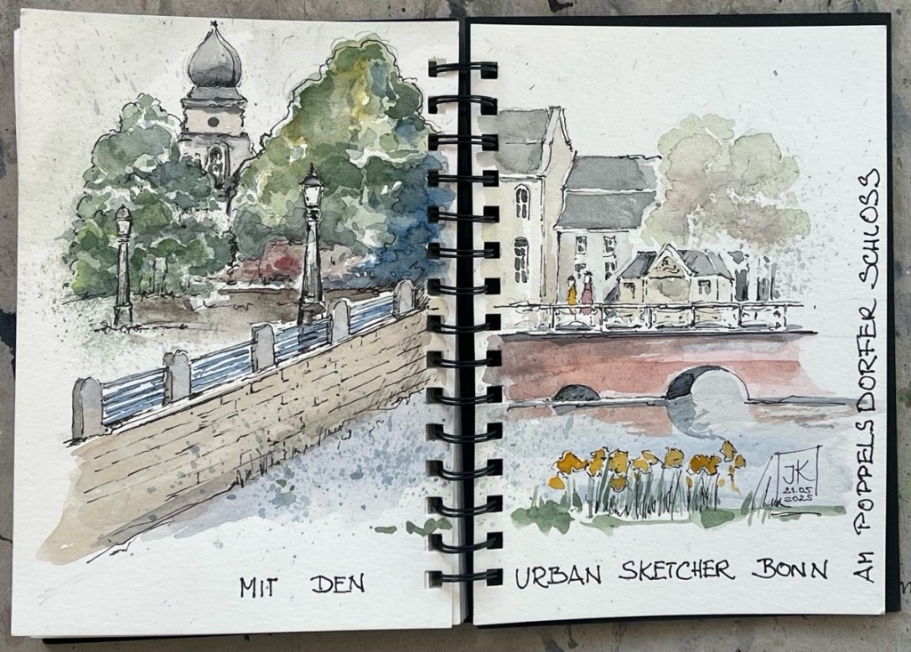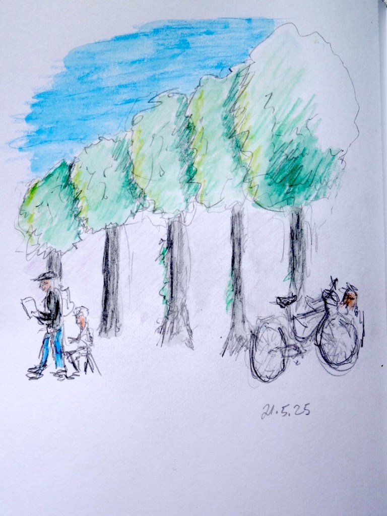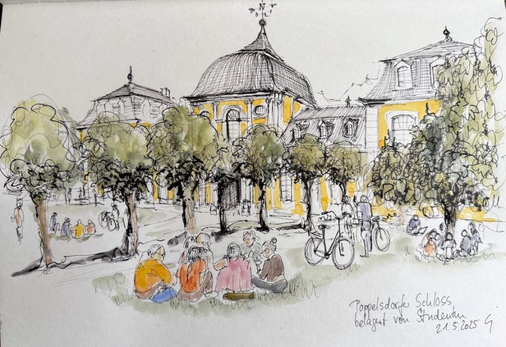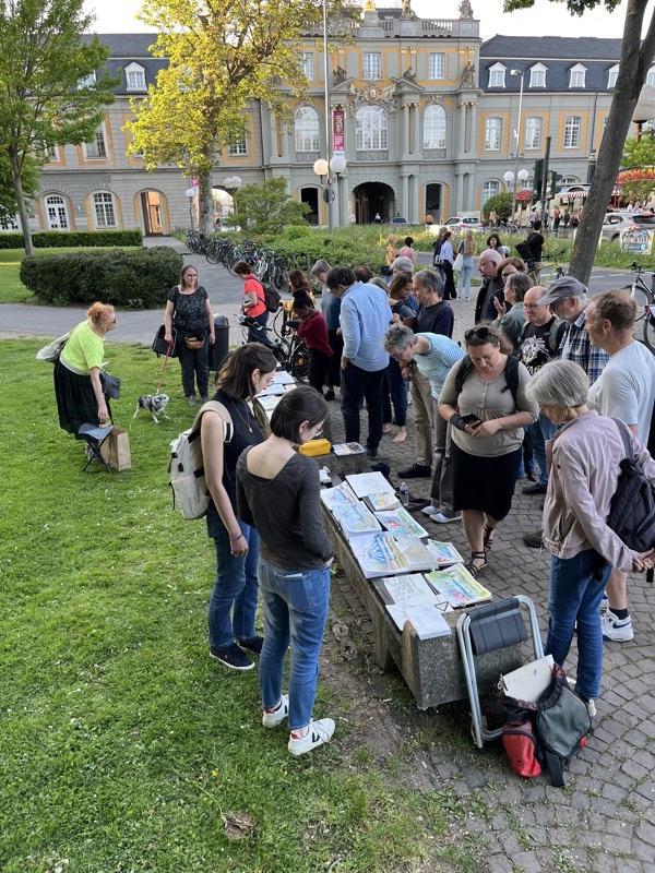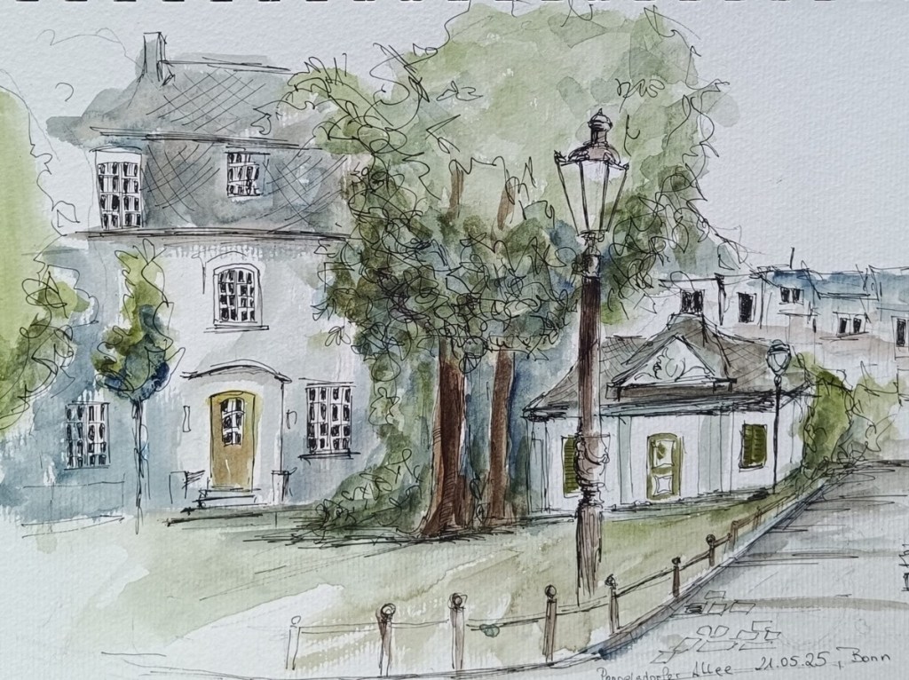 Am kommenden Mittwoch, dem 21.05.2025, treffen wir uns im oberen, südwestlichen Bereich der Poppelsdorfer Allee, also am Schloss, am Teich, an der Brücke ab 18 Uhr oder früher, wer kann. Die Kastanien der Allee sind gerade prächtig, blühen noch teilweise, das Schloss ist mal nicht eingerüstet und bei gutem Wetter sammelt sich dann viel Volk auf der Wiese davor. Am Gärtnerhäuschen wird Boule gespielt, es wird flaniert am Teich und diese schöne Atmosphäre wollen wir in unseren Sketchen festhalten. Die Vernissage machen wir um 19:30 Uhr an der kleinen Brücke oder dort in der Nähe.