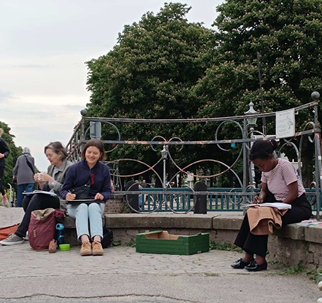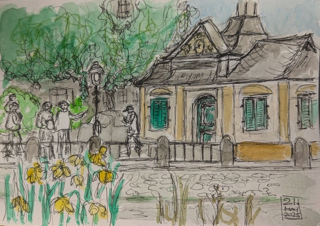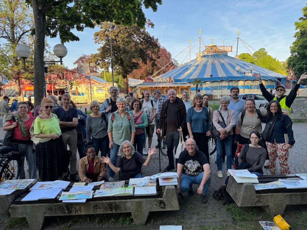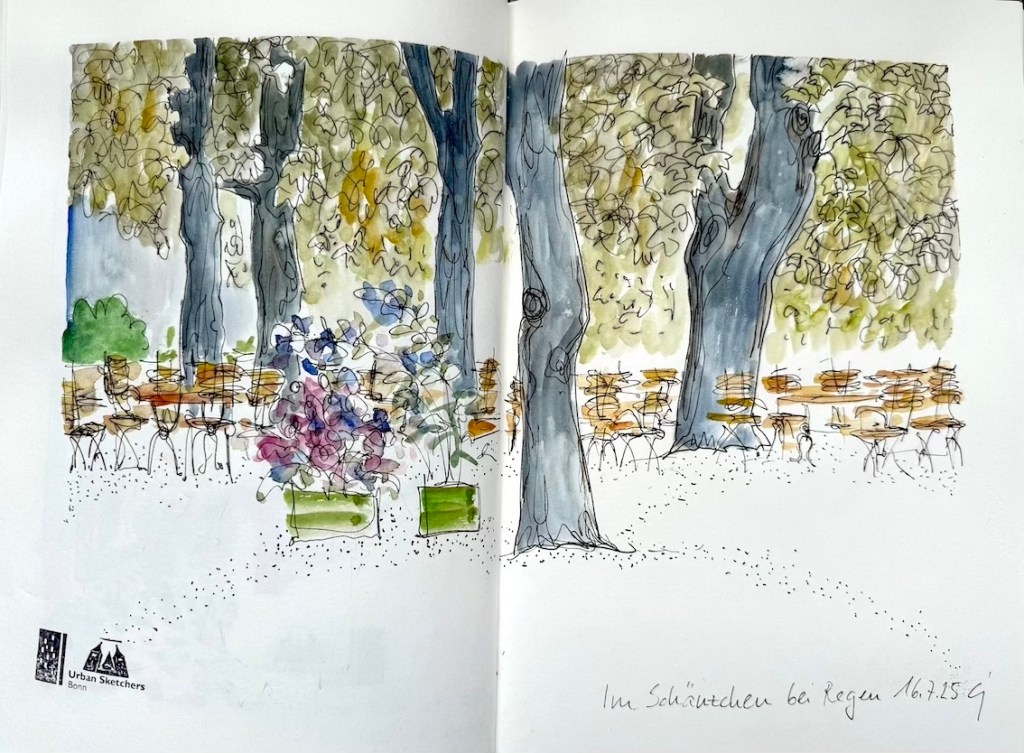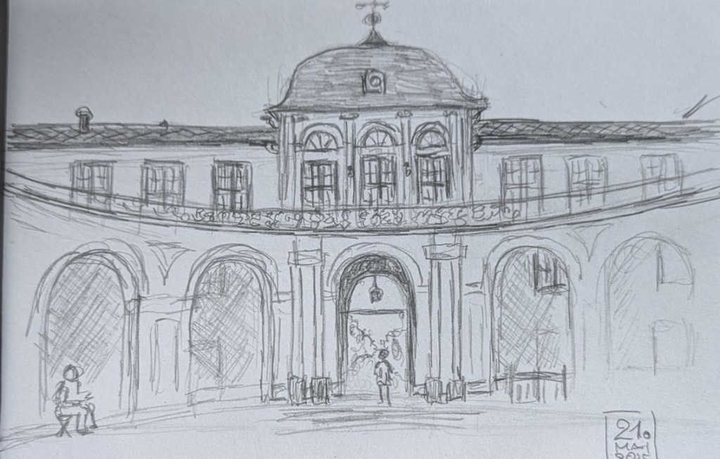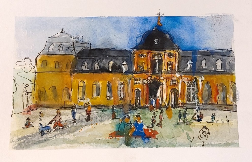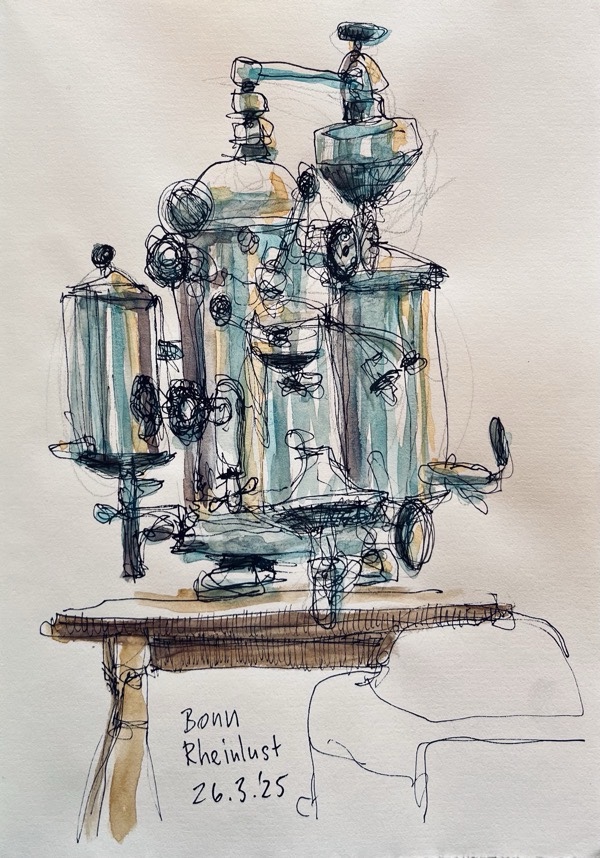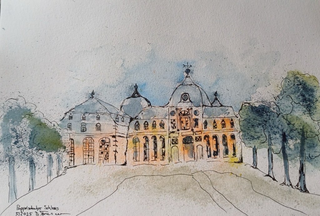 Am kommenden Mittwoch, dem 21.05.2025, treffen wir uns im oberen, südwestlichen Bereich der Poppelsdorfer Allee, also am Schloss, am Teich, an der Brücke ab 18 Uhr oder früher, wer kann. Die Kastanien der Allee sind gerade prächtig, blühen noch teilweise, das Schloss ist mal nicht eingerüstet und bei gutem Wetter sammelt sich dann viel Volk auf der Wiese davor. Am Gärtnerhäuschen wird Boule gespielt, es wird flaniert am Teich und diese schöne Atmosphäre wollen wir in unseren Sketchen festhalten. Die Vernissage machen wir um 19:30 Uhr an der kleinen Brücke oder dort in der Nähe.