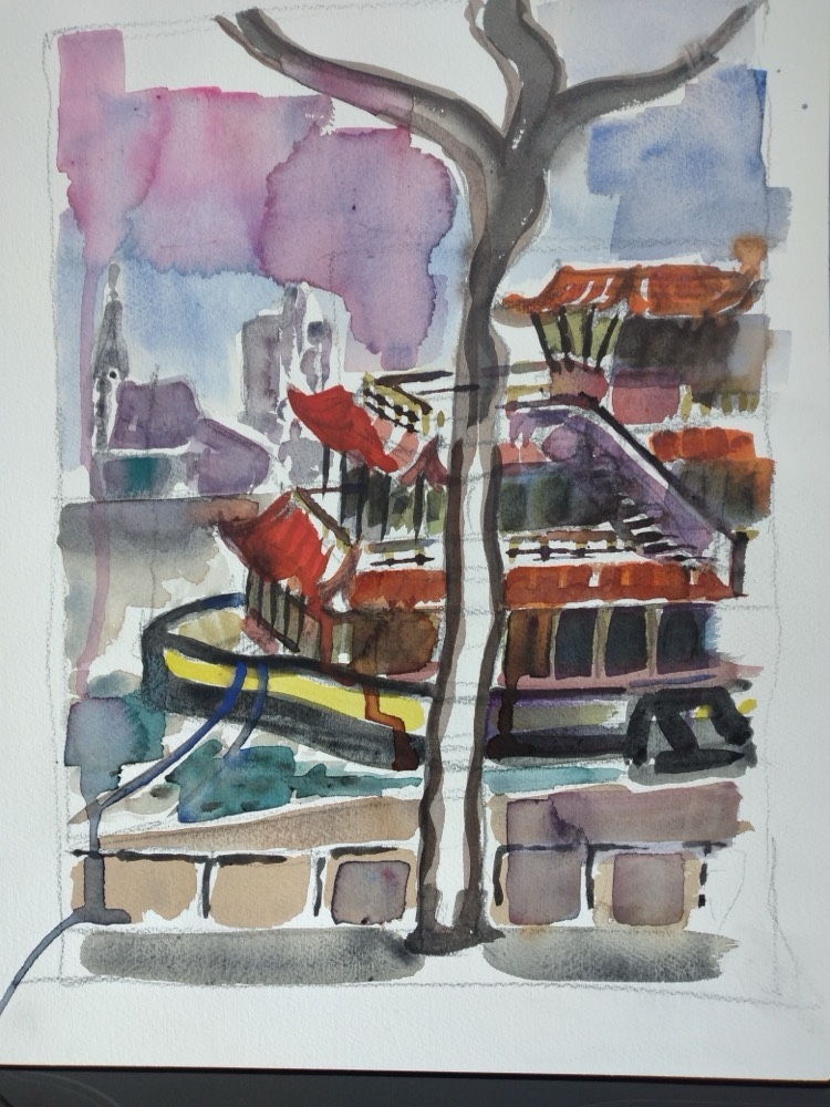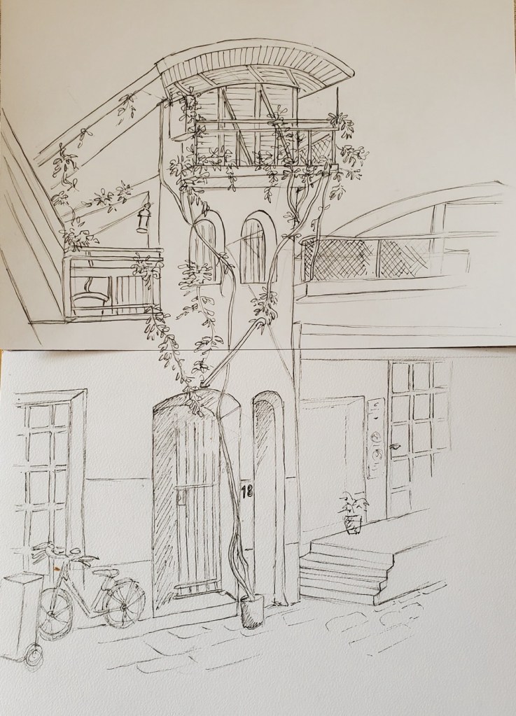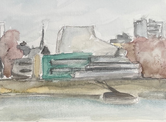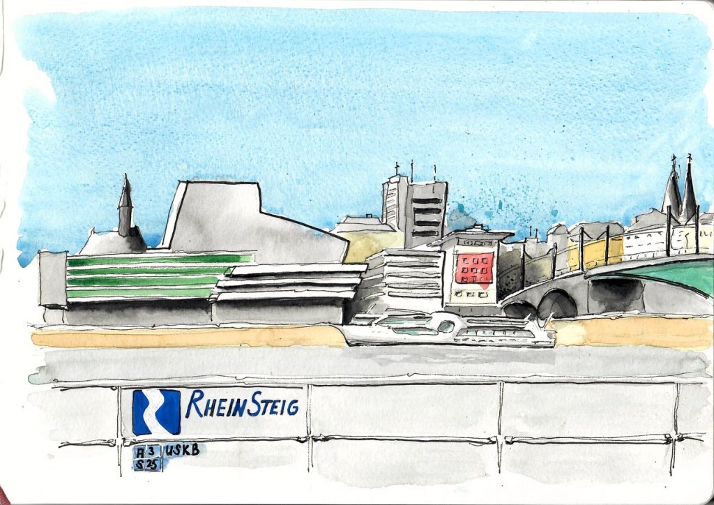 Es war schon ziemlich kalt und daher gingen einige ziemlich früh in die Rheinlust. Am Ende trafen wir uns alle drinnen. Aber erstmal hier unsere Zeichnungen/Skizzen von draußen, in der Nähe der Kennedybrücke: