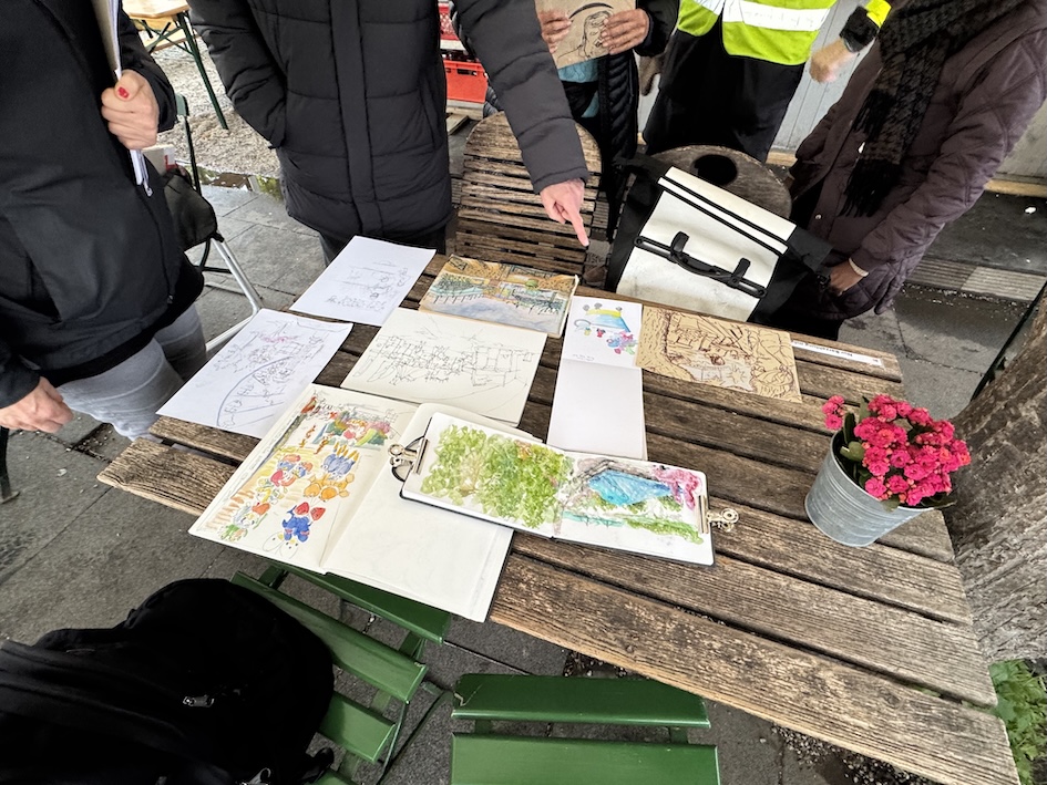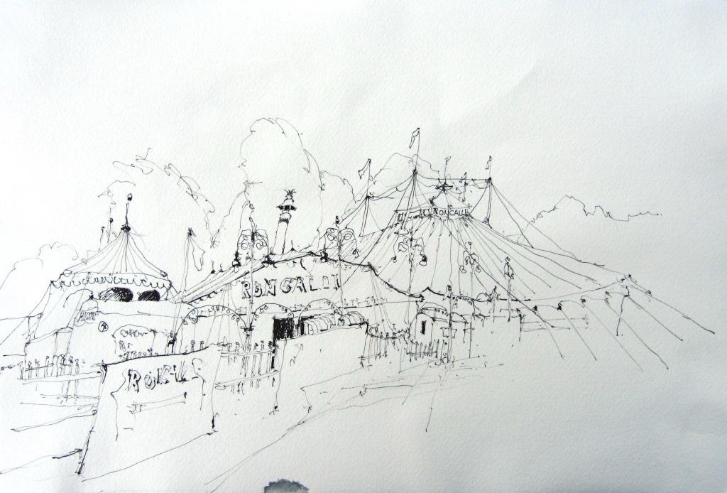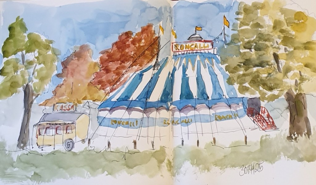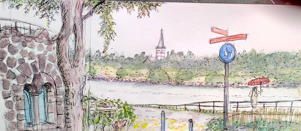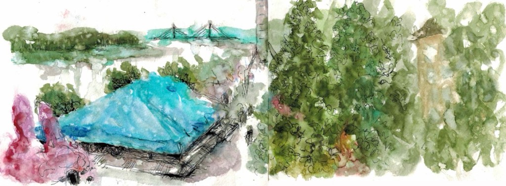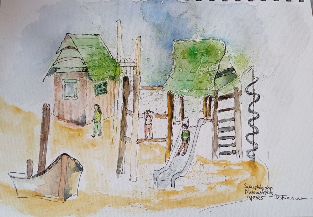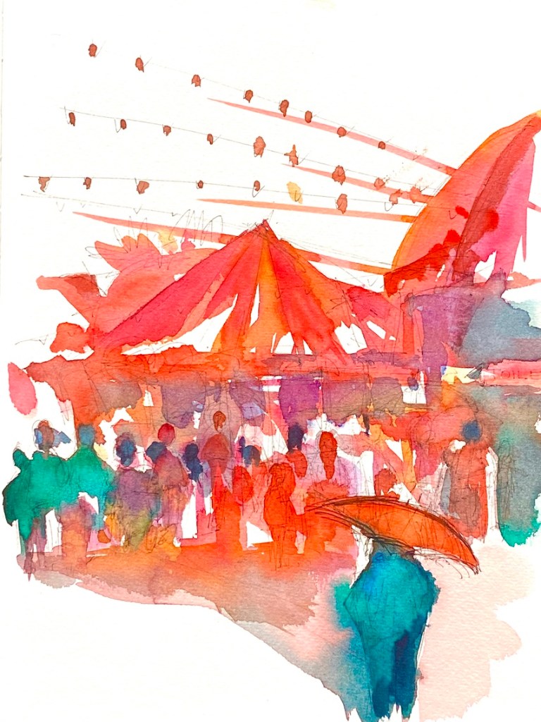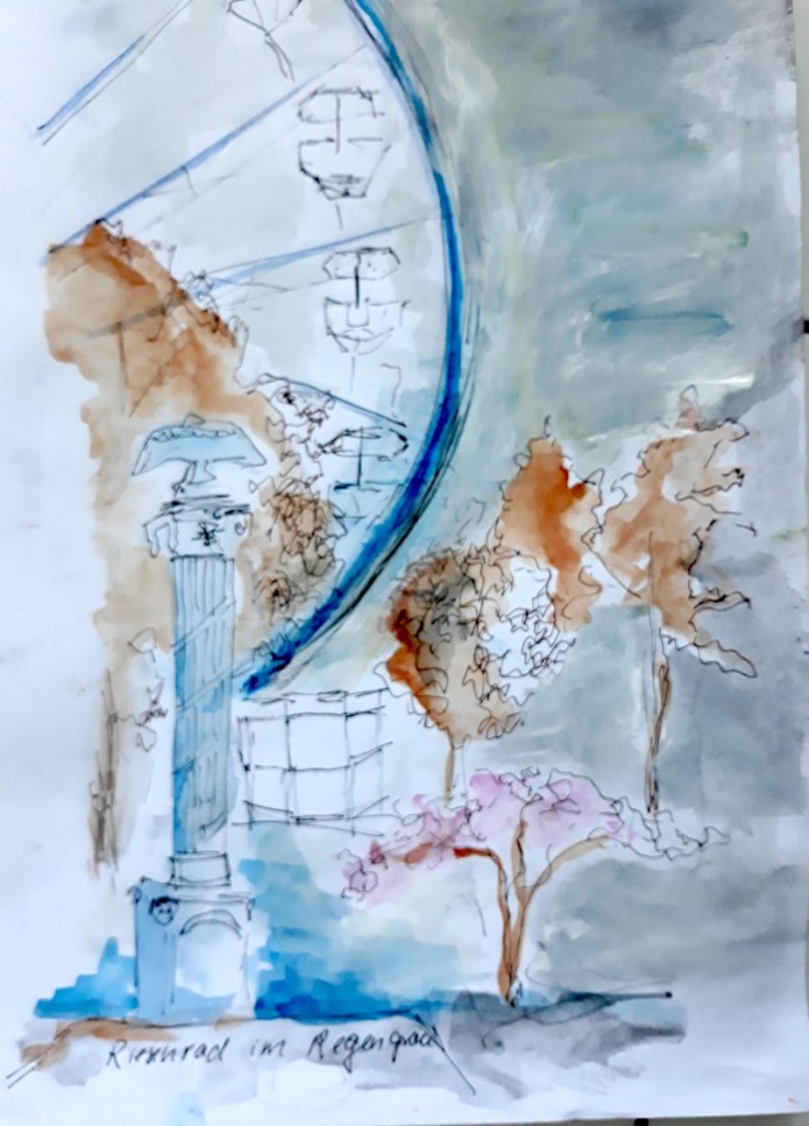 Schade, dass der ja durchaus für die Natur notwendige Regen ausgerechnet dann fiel, als wir zeichnen wollten! So kamen nur wenige unentwegte Sketcher und fanden mehrheitlich unter der Brücke ein trockenes Plätzchen. Erstaunlich allerdings, dass sich die Besucher nicht abhalten ließen – auch bei Regen viel Trubel und drehende Karussells. Hier unsere Skizzen: