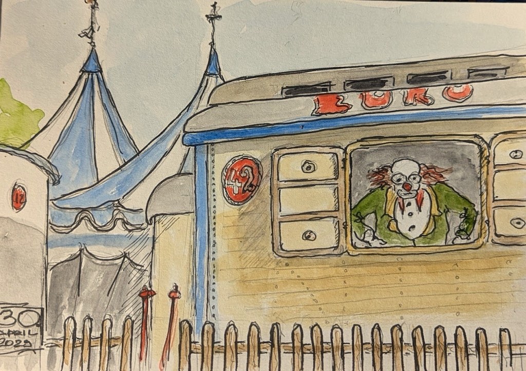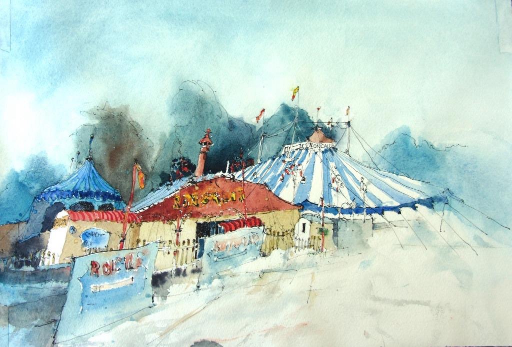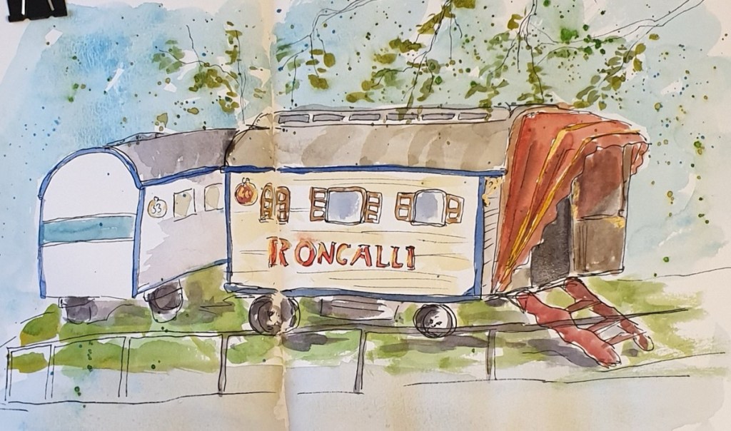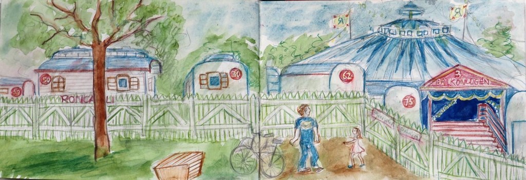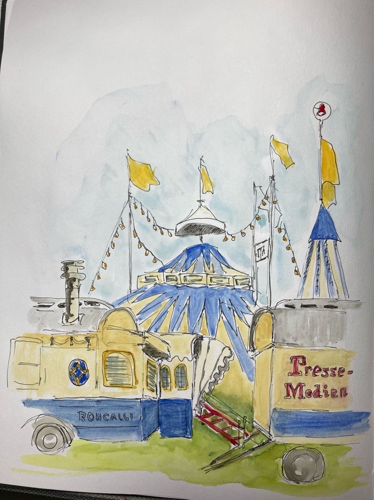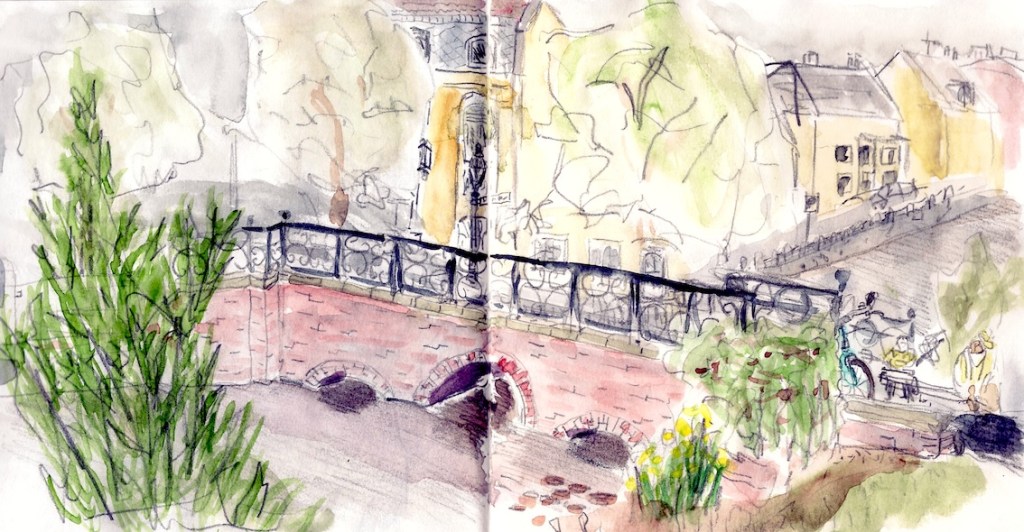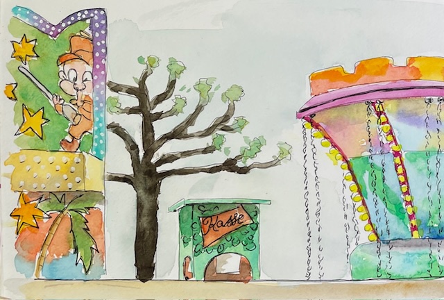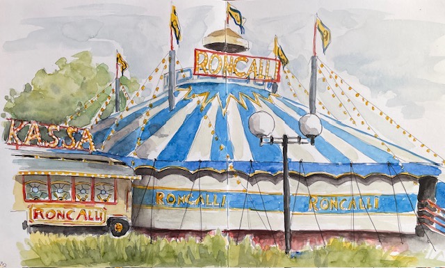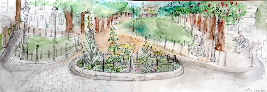 Schade, dass der ja durchaus für die Natur notwendige Regen ausgerechnet dann fiel, als wir zeichnen wollten! So kamen nur wenige unentwegte Sketcher und fanden mehrheitlich unter der Brücke ein trockenes Plätzchen. Erstaunlich allerdings, dass sich die Besucher nicht abhalten ließen – auch bei Regen viel Trubel und drehende Karussells. Hier unsere Skizzen: