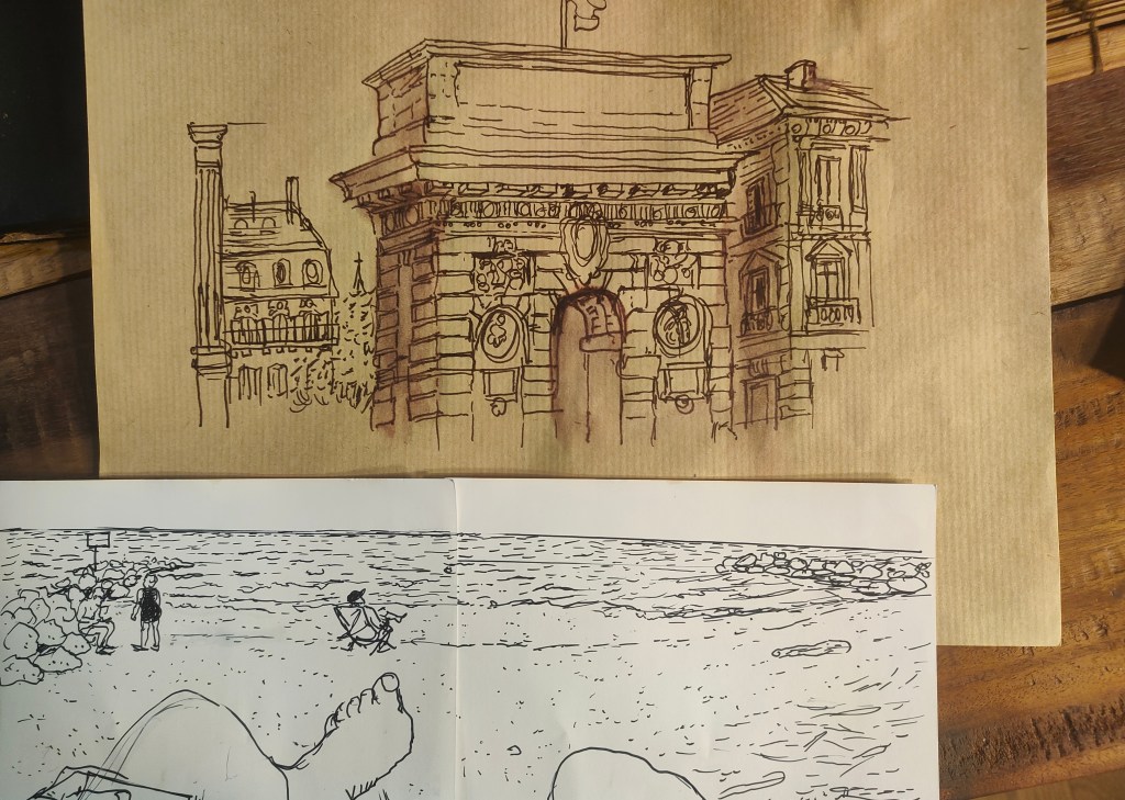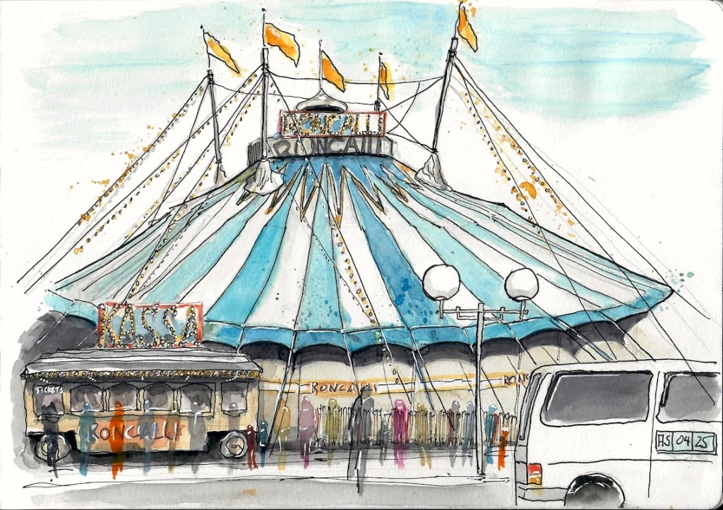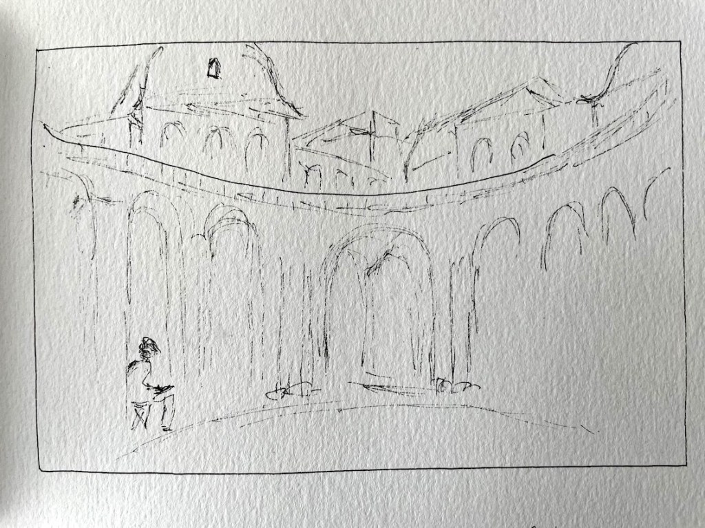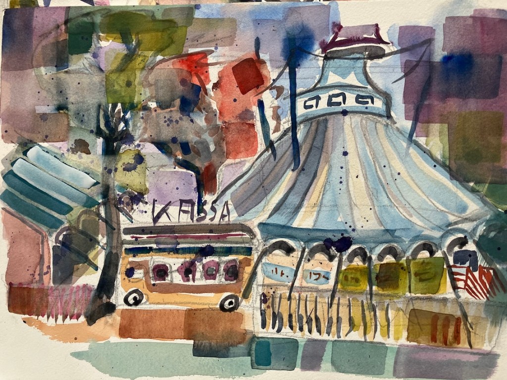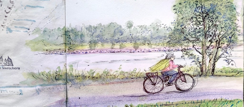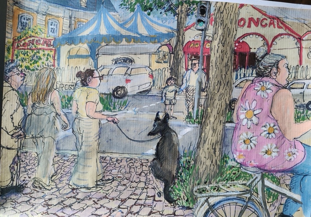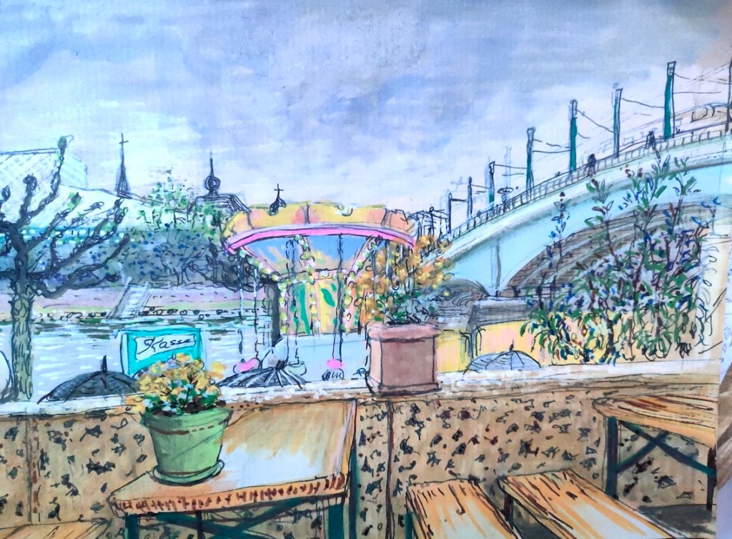 Schade, dass der ja durchaus für die Natur notwendige Regen ausgerechnet dann fiel, als wir zeichnen wollten! So kamen nur wenige unentwegte Sketcher und fanden mehrheitlich unter der Brücke ein trockenes Plätzchen. Erstaunlich allerdings, dass sich die Besucher nicht abhalten ließen – auch bei Regen viel Trubel und drehende Karussells. Hier unsere Skizzen: