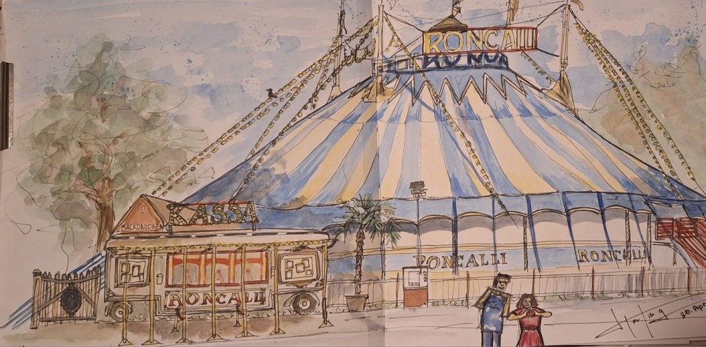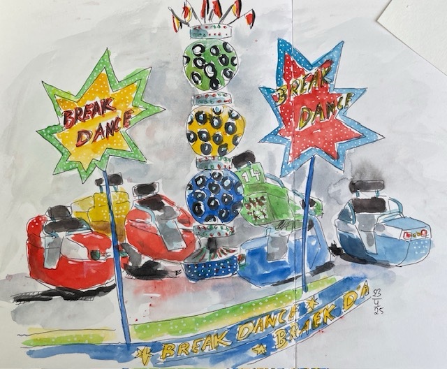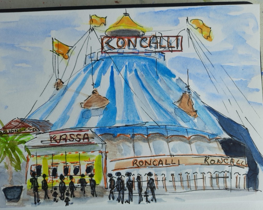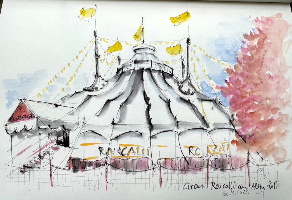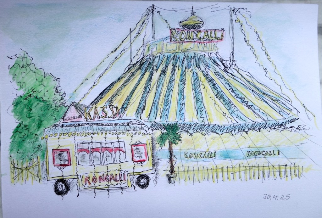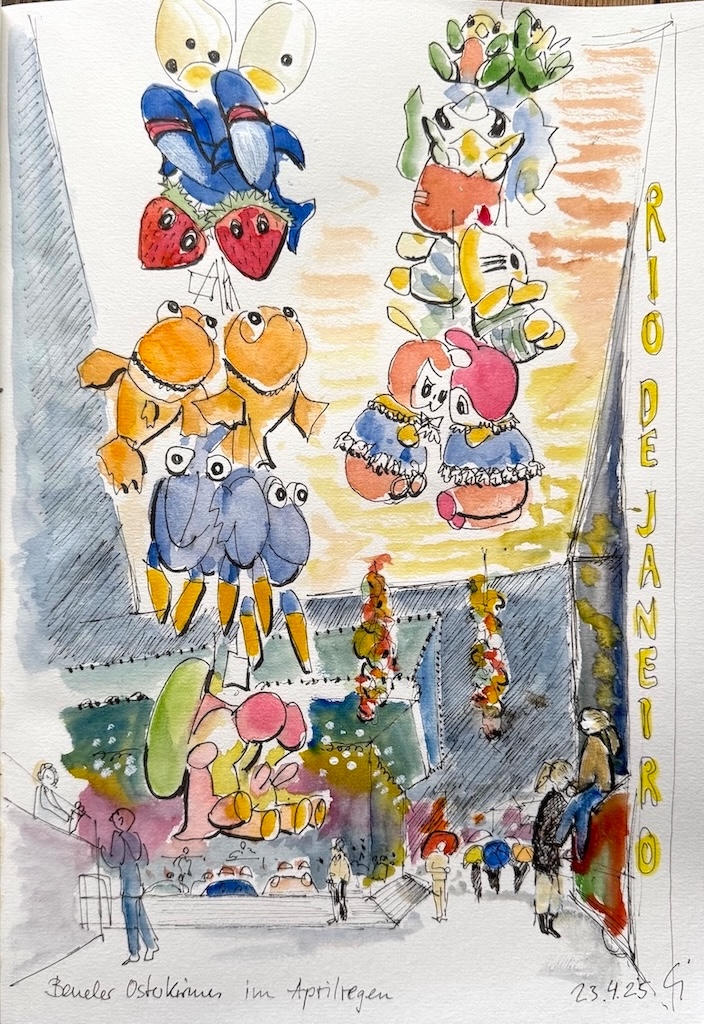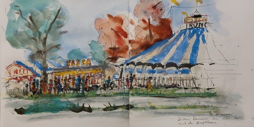 Diesmal gehts zum Budenzauber auf der Beueler Rheinseite an der Kennedybrücke: die Osterkirmes ist dort aufgebaut. Zwischen Riesenrad und Schleuderkarussell gibt es Zuckerwatte und Currywurst, Wurfstände mit Kitsch und Krempel, Gerangel beim Autoscooter, allerlei angeblich Essbares in allen Farben, leuchtende Kinderaugen und quengelnde Eltern – kurz: alles was das Herz begehrt. Und für uns Zeichner ist es natürlich ein Augenschmaus! So viele Motive! Wir treffen uns dort am Fuß der Kennedybrücke am Mittwoch, dem 23.04.2025, ab 18 Uhr oder auch früher. Jeder sucht sich sein Motiv; eine Sitzgelegenheit mitzubringen ist ratsam, ebenso warme Kleidung. Die Vernissage machen wir um 19:30 Uhr auf einem der unteren Biertische bei der „Rheinlust“ oder, falls es regnet, unter der Brücke.