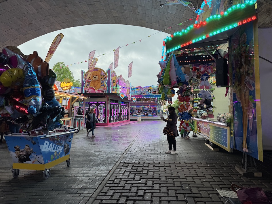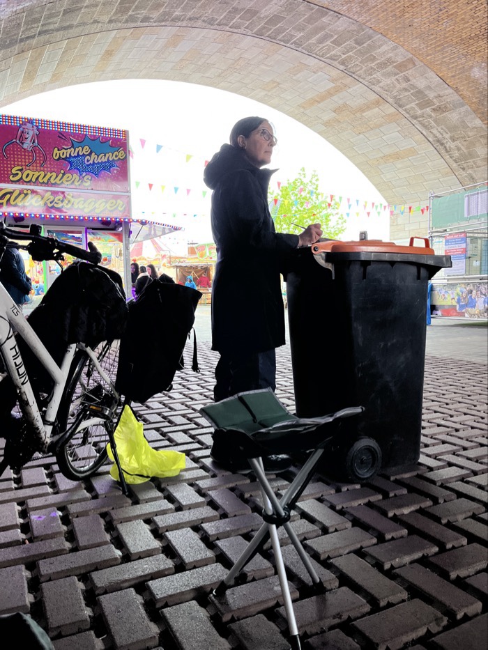 Helmut – trotz des Regens buntes Treiben Kirsten – Breakdance im Regen Andrea – Riesenrad im Regengroll Stuart – Blick von der Kennedy Brücke aus Cornelia H. – Karussell vor Kennedybrücke und Oper. Im Regen leuchten die Farben besonders schön! Holger – Kirmes im Regen Cornelia J. – Firlefanz und Autoscooter im Aprilregen Kirsten – Buden, von der überdachten Terrasse der Rheinlust aus gesehen Cornelia H – mit Mitzeichnerin in der Rheinlust Andrea – Dosenwerfen Helmut – Mitzeichnerin an Mülltonnentisch
