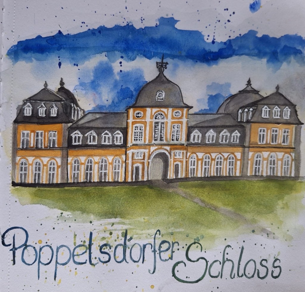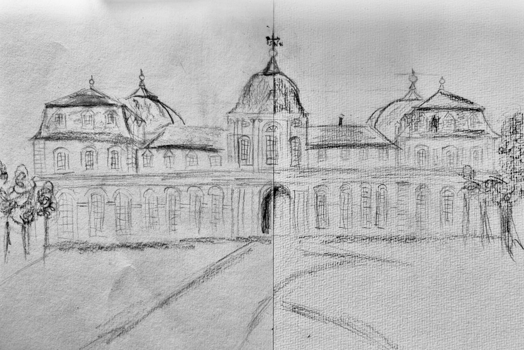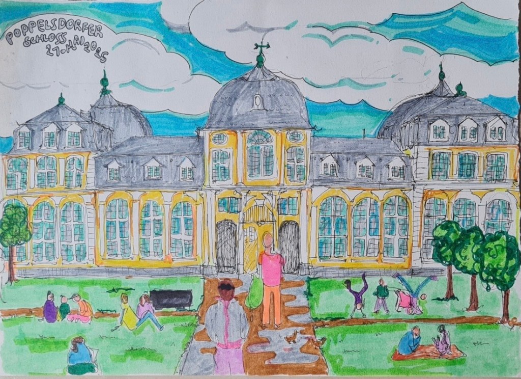 Ralf – Sketch vorm Schloss, Lagernde auf der Wiese Andreas – Teilansicht des Poppelsdorfer Schlosses Silke – Dixi und Silo vorm Schloss Helmut – der Mittelbau des Schlosses Helmut – hereinspaziert ins Schloss! Birgitt – im runden Innenhof des Schlosses Ilse – Holger zeichnet im Poppelsdorfer Schlosshof Holger – grüßt aus dem runden Inneren des Poppelschlosses