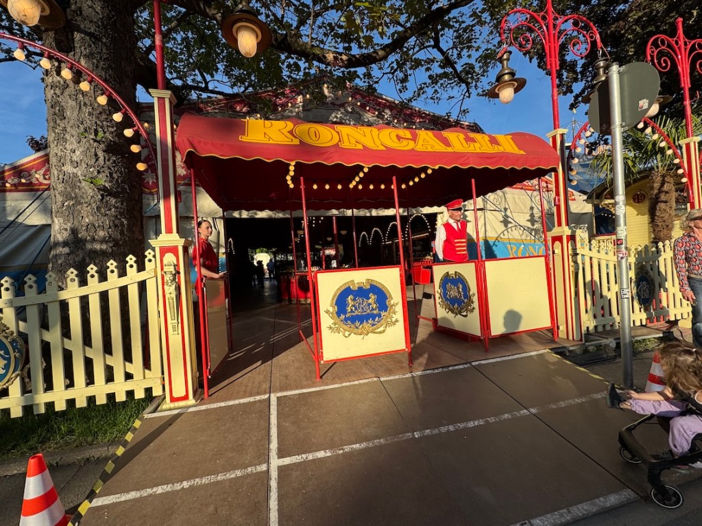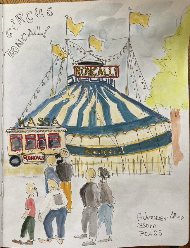 Weiter gehts mit Budenzauber: zwischen Altem Zoll und Koblenzer Tor an der Adenauer Allee hat der Circus Roncalli sein Zelt aufgeschlagen. Drumherum eine Wagenburg, die Unterkünfte der Schaugestalter. Das alles wandelt diesen Ort temporär magisch um: ein bißchen Versteckspiel – wo ist der Genius BTHVNs? Wie kommt man überhaupt da durch? Das Zelt von Roncalli vor dem Koblenzer Tor, Durchblicke zum Biergarten, EMA vor Zirkuswagen, Wartende vor dem Kassenhäuschen – viele Motive auf jeden Fall! Und das Wetter soll herrlich sein. Was will man mehr?!! Sitzgelegenheit besser selber mitbringen!