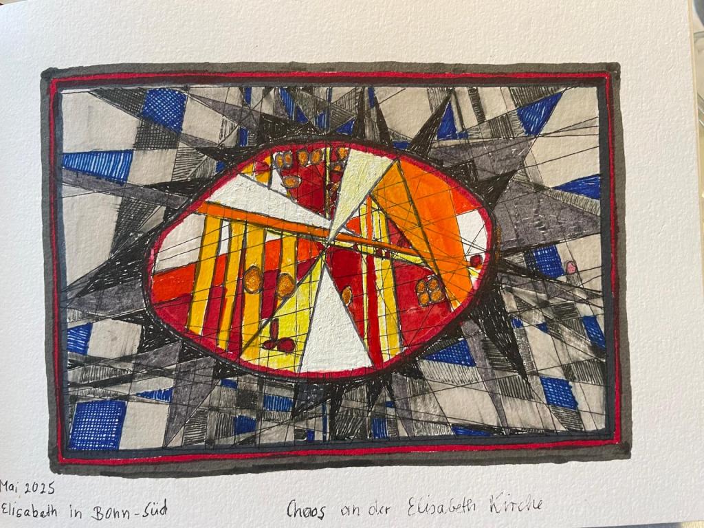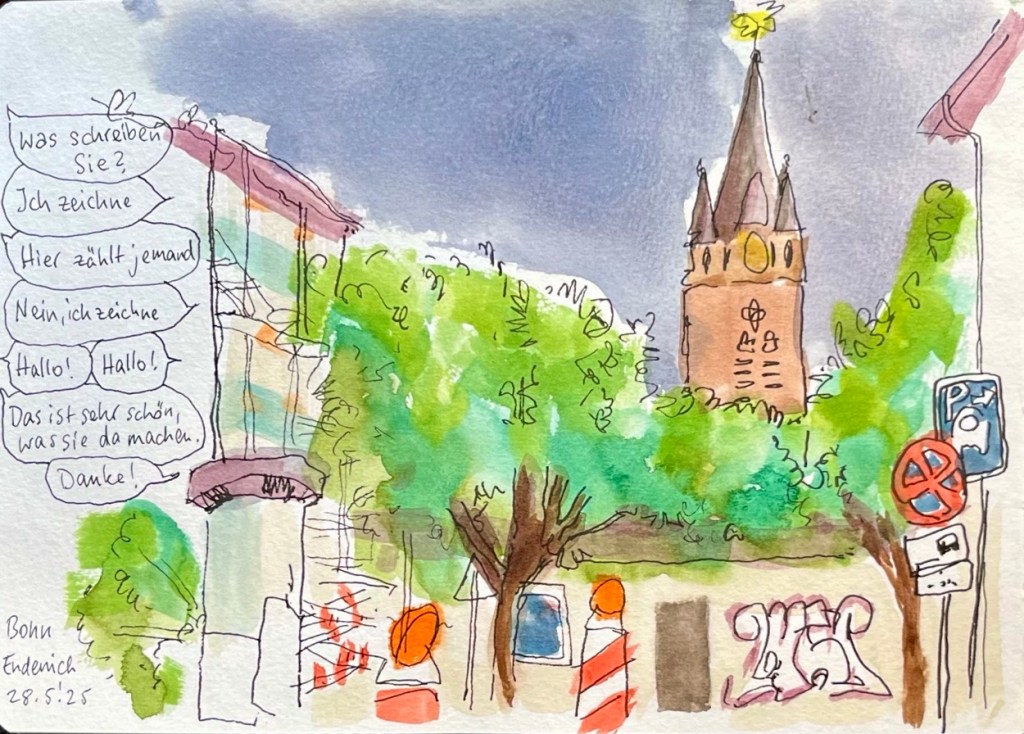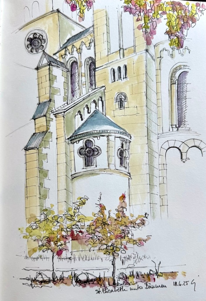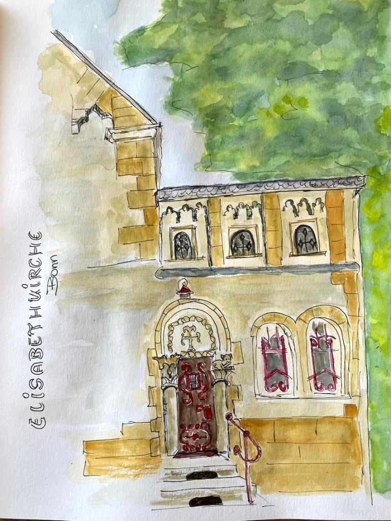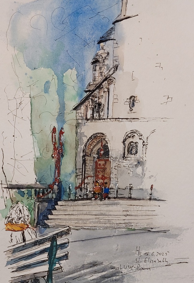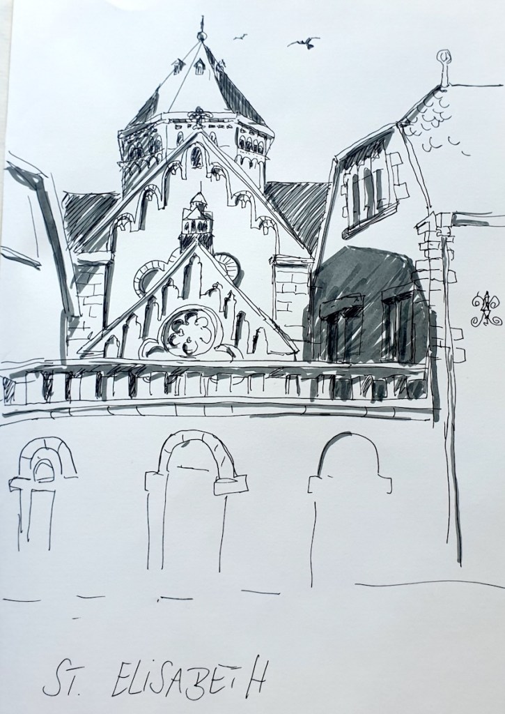 Am nächsten Mittwoch, dem 18.06.2025, treffen wir uns ab 18:00 Uhr an der Elisabethkirche in der Bonner Südstadt. Zwischen Schumannstraße, Bernard Custodis Strasse, An der Elisabethkirche und Diezstraße liegt diese neuromanische Kirche aus der Gründerzeit eingebettet in viel Grün. Für Zeichner gibt es viel zu entdecken: Details oder das große Ganze, die 20er Jahre Bauten der Umgebung, Kinderspiel und Bahnverkehr, beeindruckende Bäume, Straßenblicke, Mitmenschen – falls das Wetter mault das Café Extro an der Ecke… Um 19:30 Uhr treffen wir uns zur Vernissage am Hauptportal zur Schumannstraße hin.