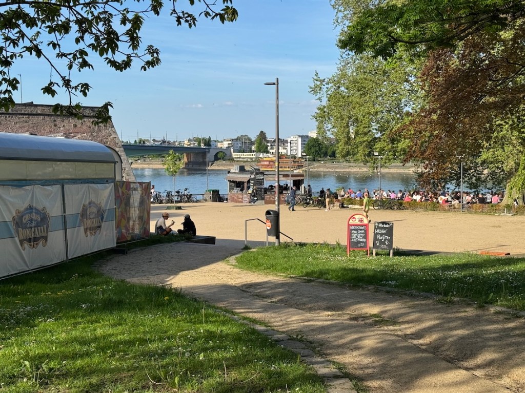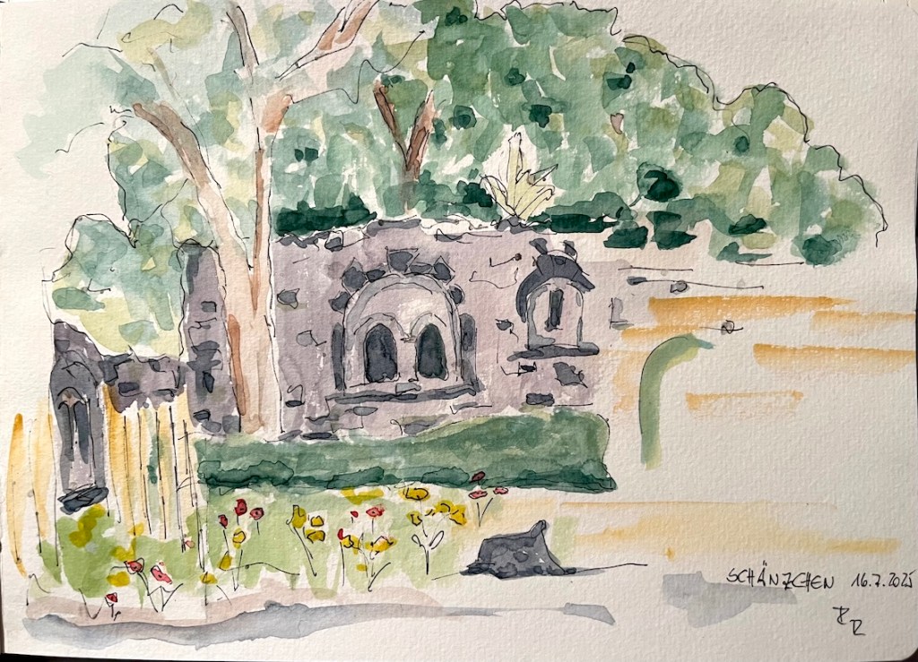 Wir treffen uns am Mittwoch, dem 16.07.2025, dort am Biergarten „Schänzchen“ (Ecke Fritz Schröder Ufer / Rosental). Ob Ihr Euch ein Plätzchen im Biergarten sucht oder Blicke über den Rhein, die gesamte Anlage oder die Darstellungen an der Mauer zeichnet, sei Euch überlassen. Auf jeden Fall ist es ein schöner Ort und Motive gibts genug. Die Vernissage machen wir um 19:30 Uhr unten bei den Tischen.