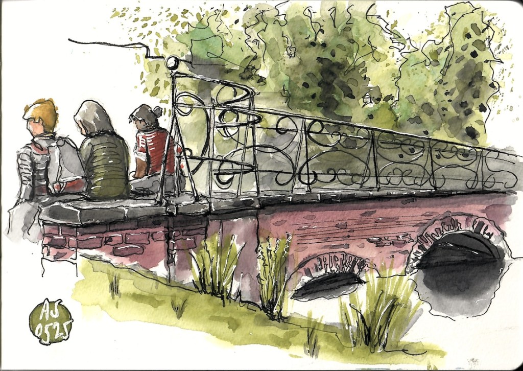 Andreas – Sitzende auf der Mauer an der Brücke überm Teich