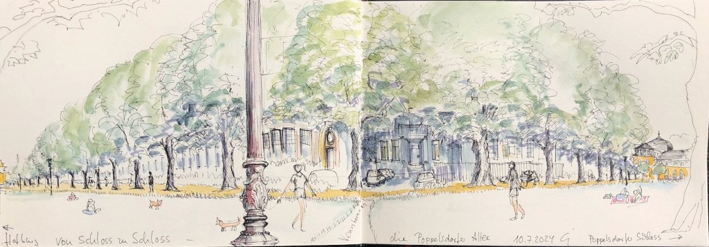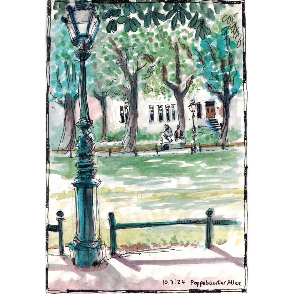 Am Mittwoch, den 10.07.2024, treffen wir uns zum Zeichnen ab 18 Uhr auf der Poppelsdorfer Allee, und zwar im oberen Teil, Richtung Poppelsdorfer Schloss. Die Allee mit Ihren schmucken Häusern, den flanierenden Menschen, den tollenden Hunden, Vorgärten, Gartenzwerge, Blumenbeete, Alleeblicke, das Weidevieh vor der Hausnummer 64 – soll Hauptmotiv sein. Da das Wetter am Mittwoch unbeständig wird, gehen wir, falls es regnet, in den Innenhof des Poppelsdorfer Schlosses unter die Arkaden.