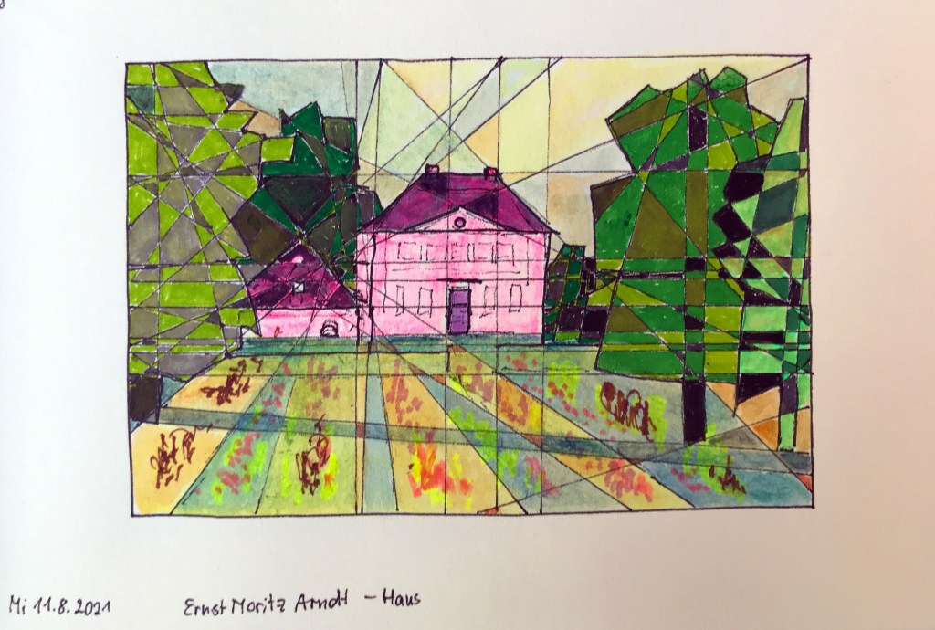 Das war für die meisten von uns eine Überraschung: hinter dem Museum König ist ein lauschiger Garten mit prachtvollen Bäumen und idyllischem Ambiente. In der Nachmittagssonne ein herrlicher Platz zum Zeichnen! Das Personal des Museums schloss den Garten für uns nicht um 6 Uhr ab, die Vernissage konnten wir drin im Aufenthaltsraum machen und ein Foto von uns allen haben sie auch noch geschossen – vielen Dank!